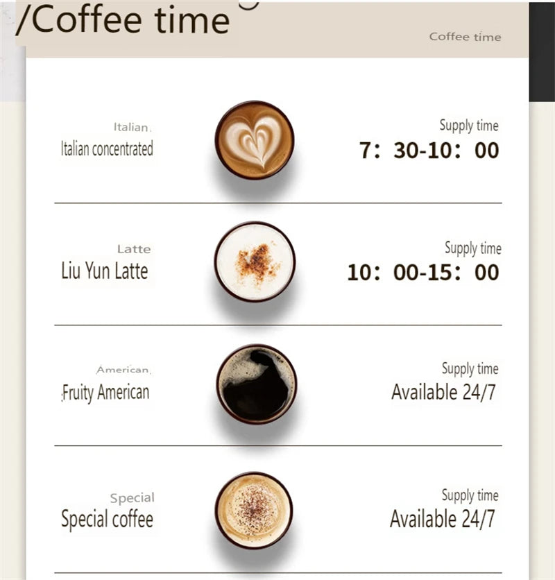- Kaffeearten: Espresso, Macchiato, Latte, Cappuccino