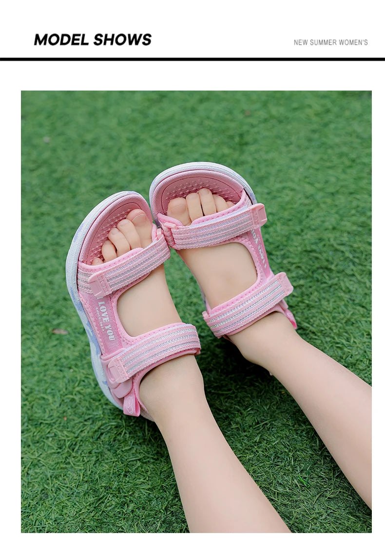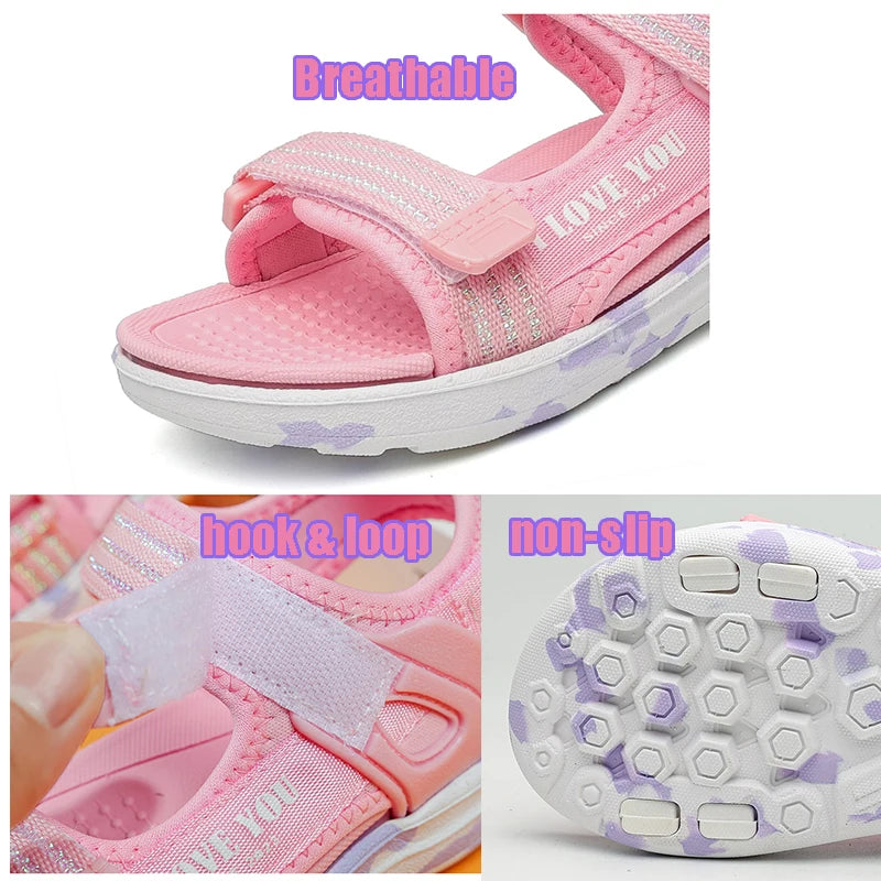 Bequeme, rutschfeste und modische Mädchen-Sandalen in Rosa mit Blumenmotiven – perfekt für aktive Kinder im Alter von 7–13 Jahren.