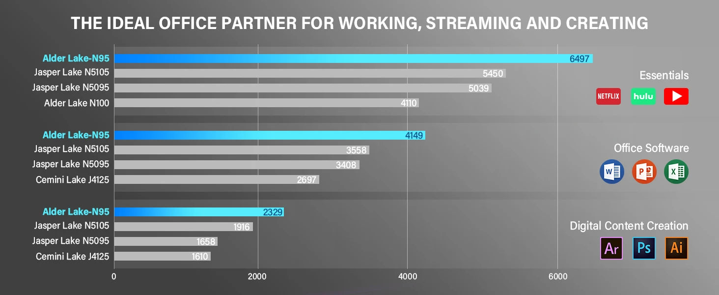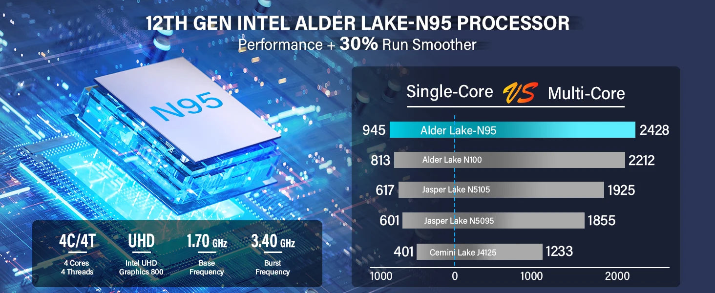 - Schneller Prozessor: Der Intel N95 mit bis zu 3,4 GHz sorgt für flüssiges Arbeiten bei Office-Anwendungen, Web-Browsing und Videokonferenzen.