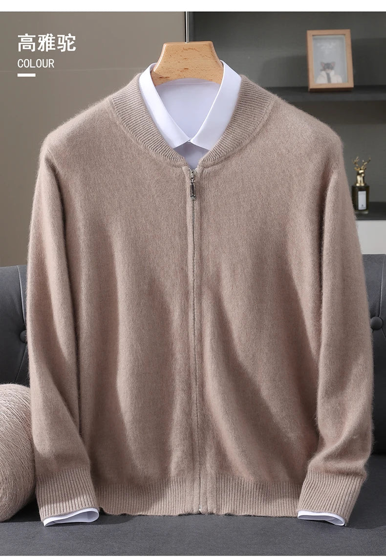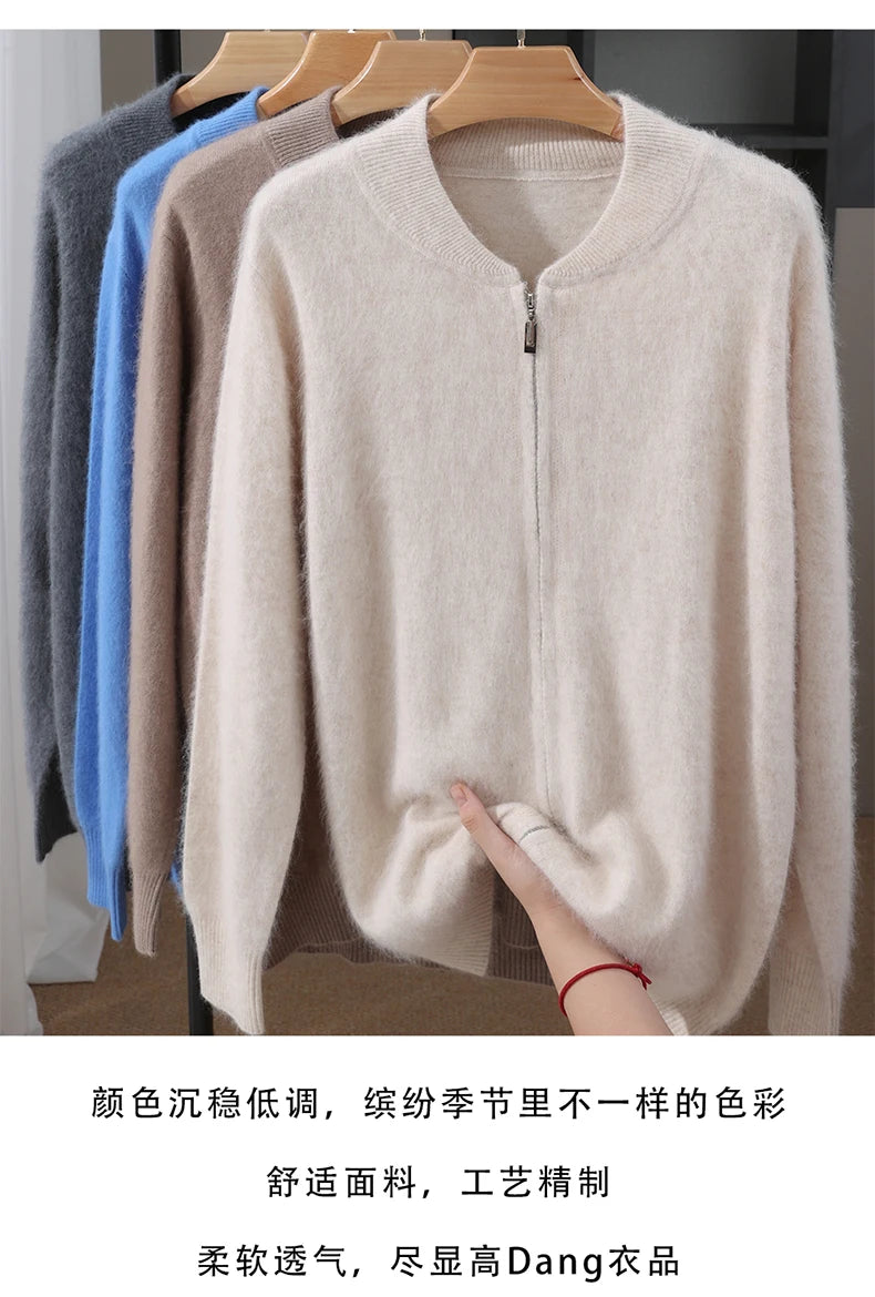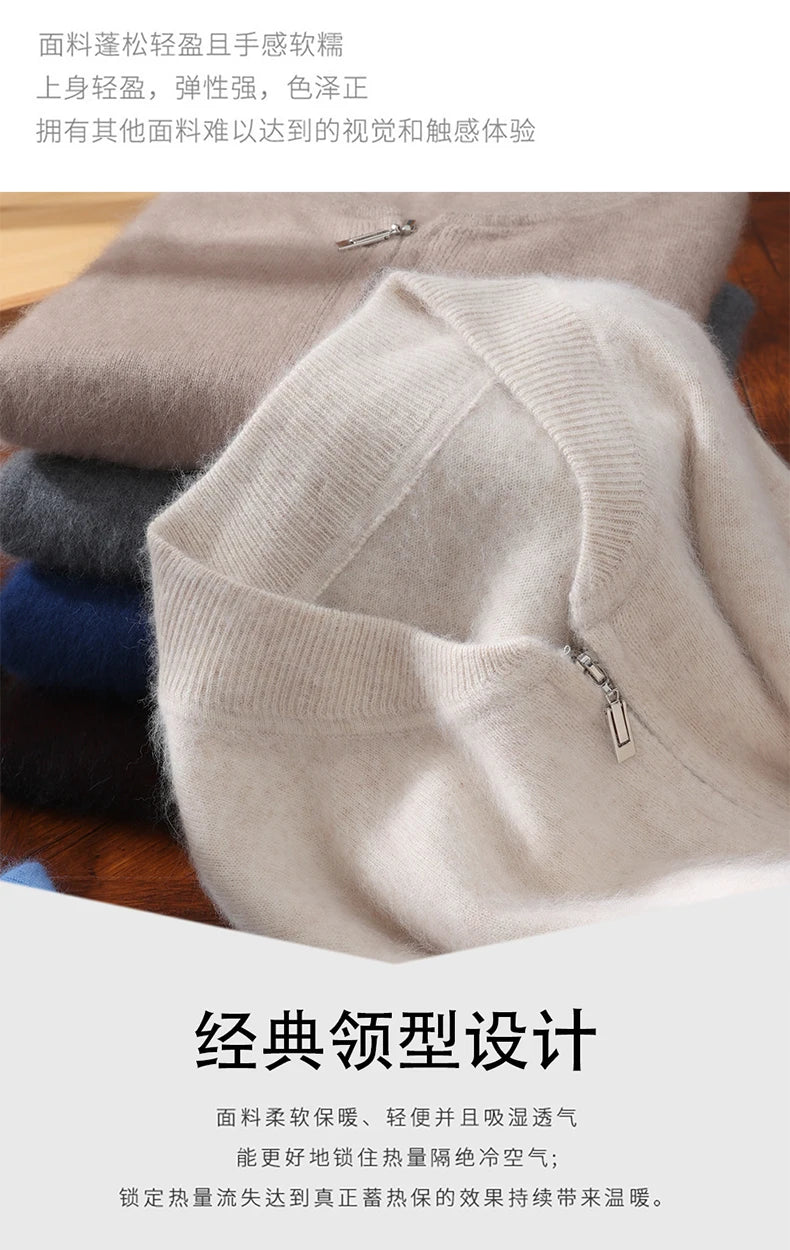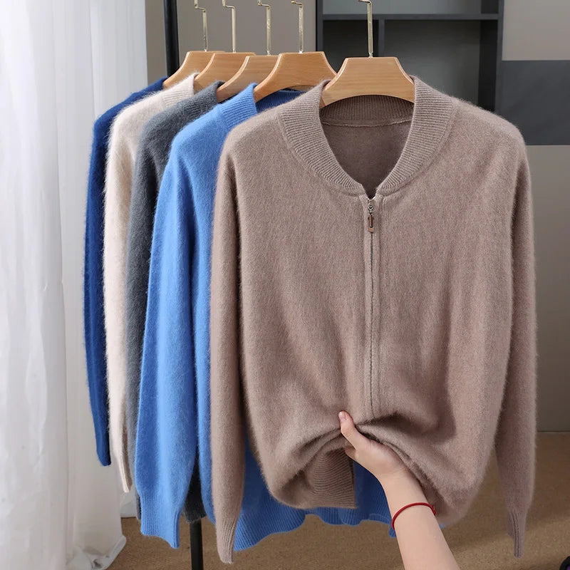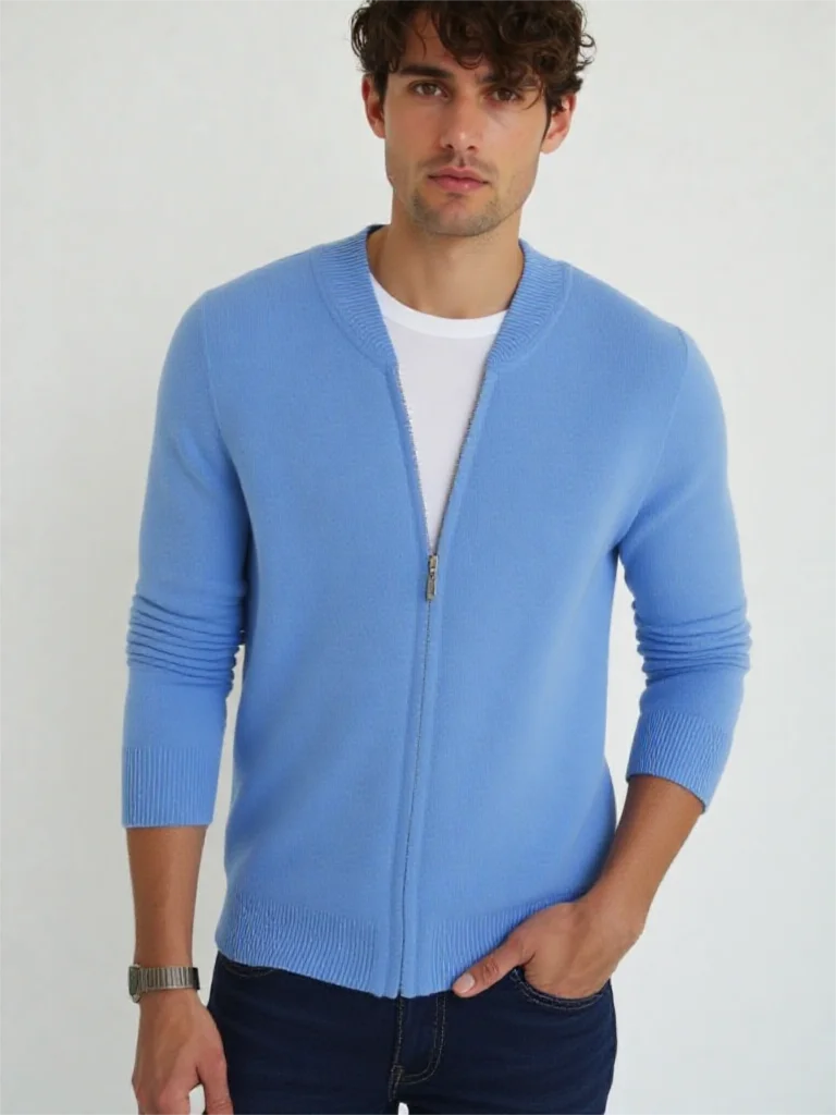 Diese Strickjacke kombiniert feines Nerz-Kaschmir-Finish mit praktischem Reißverschluss für stilvollen Schutz gegen Kälte und anspruchsvolle Alltagstauglichkeit. Der klare Schnitt und der hochabschließende Stehkragen machen dieses Modell zu einer sofort einsetzbaren Ergänzung Ihrer Garderobe – ideal für schlichte, aber gepflegte Looks in Herbst und Winter.
