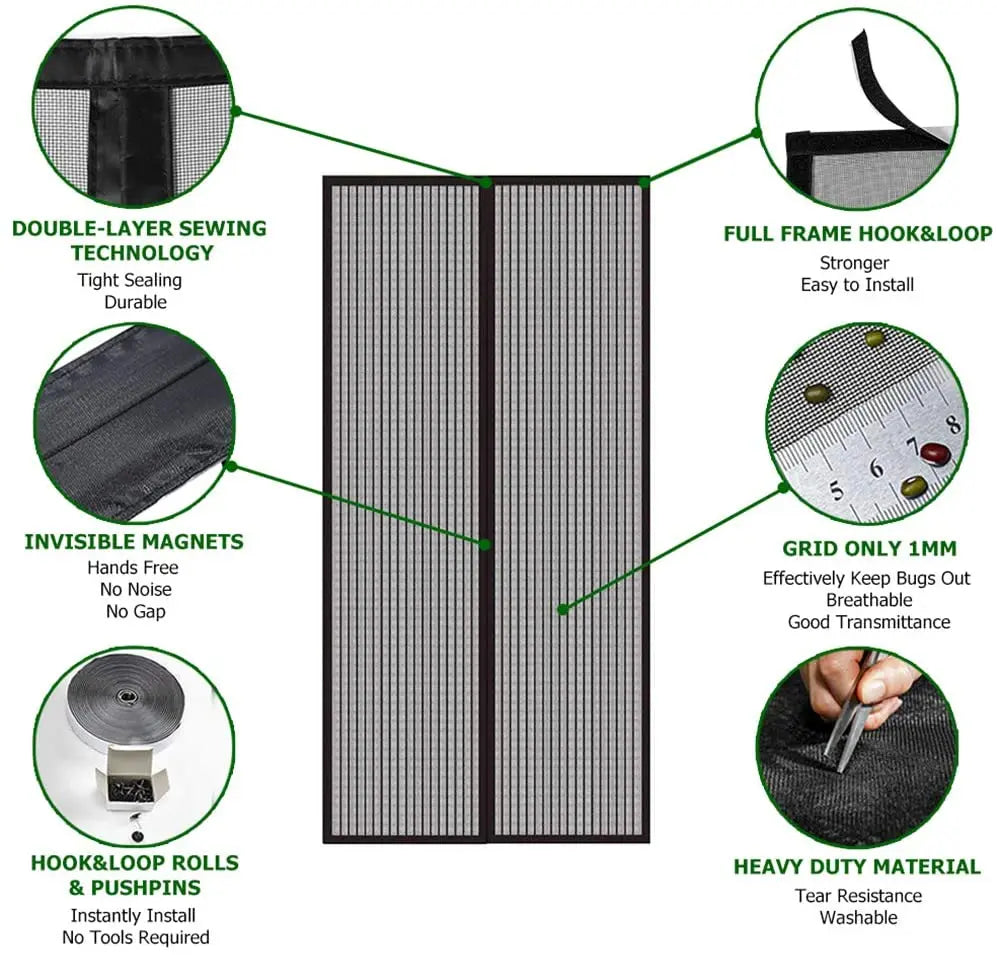 - Automatische Schließfunktion: Das magnetische Netz schließt nach dem Durchgang selbstständig, sodass keine Lücke entsteht und Insekten nicht eindringen können.