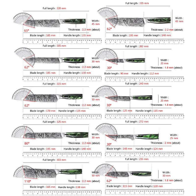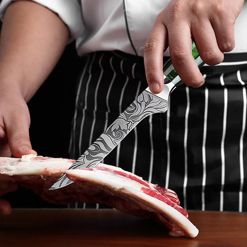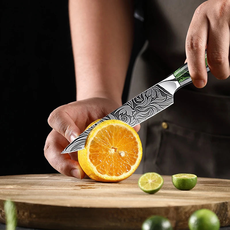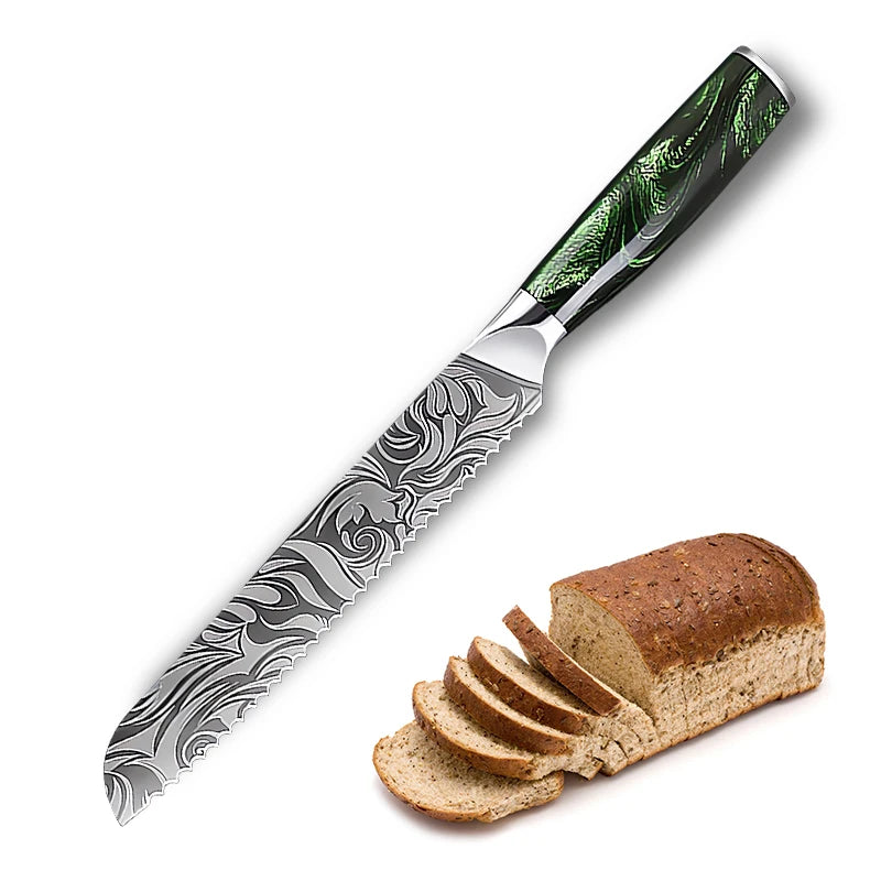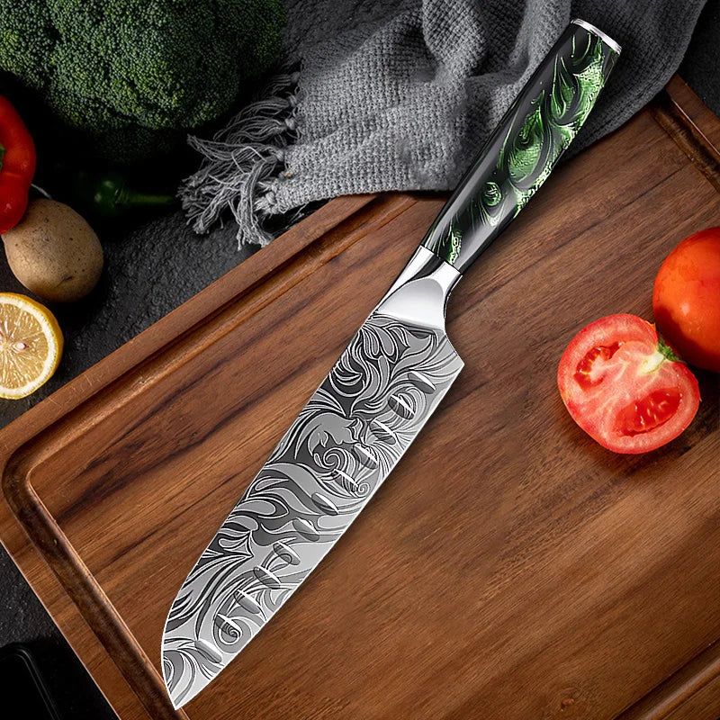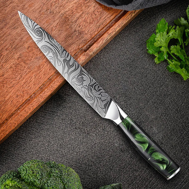 Super Sharp Damascus Pattern Kitchen Knife Set High Quality Chef Santoku Boning Paring Knife Series Green Resin Handle Nice Gift