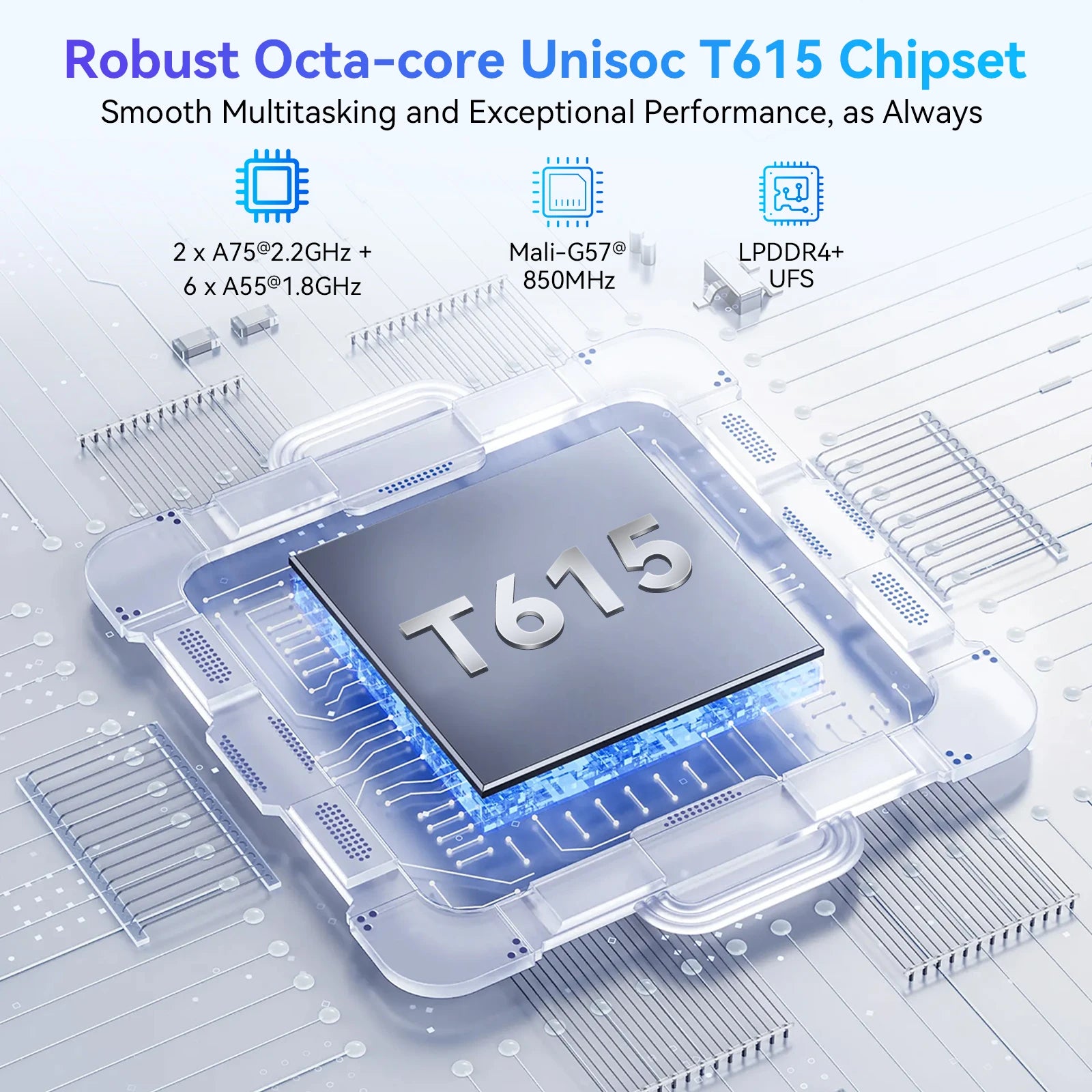 - Prozessor: Unisoc Tiger T615, Octa-Core (2x A75@2,2 GHz + 6x A55@1,8 GHz)