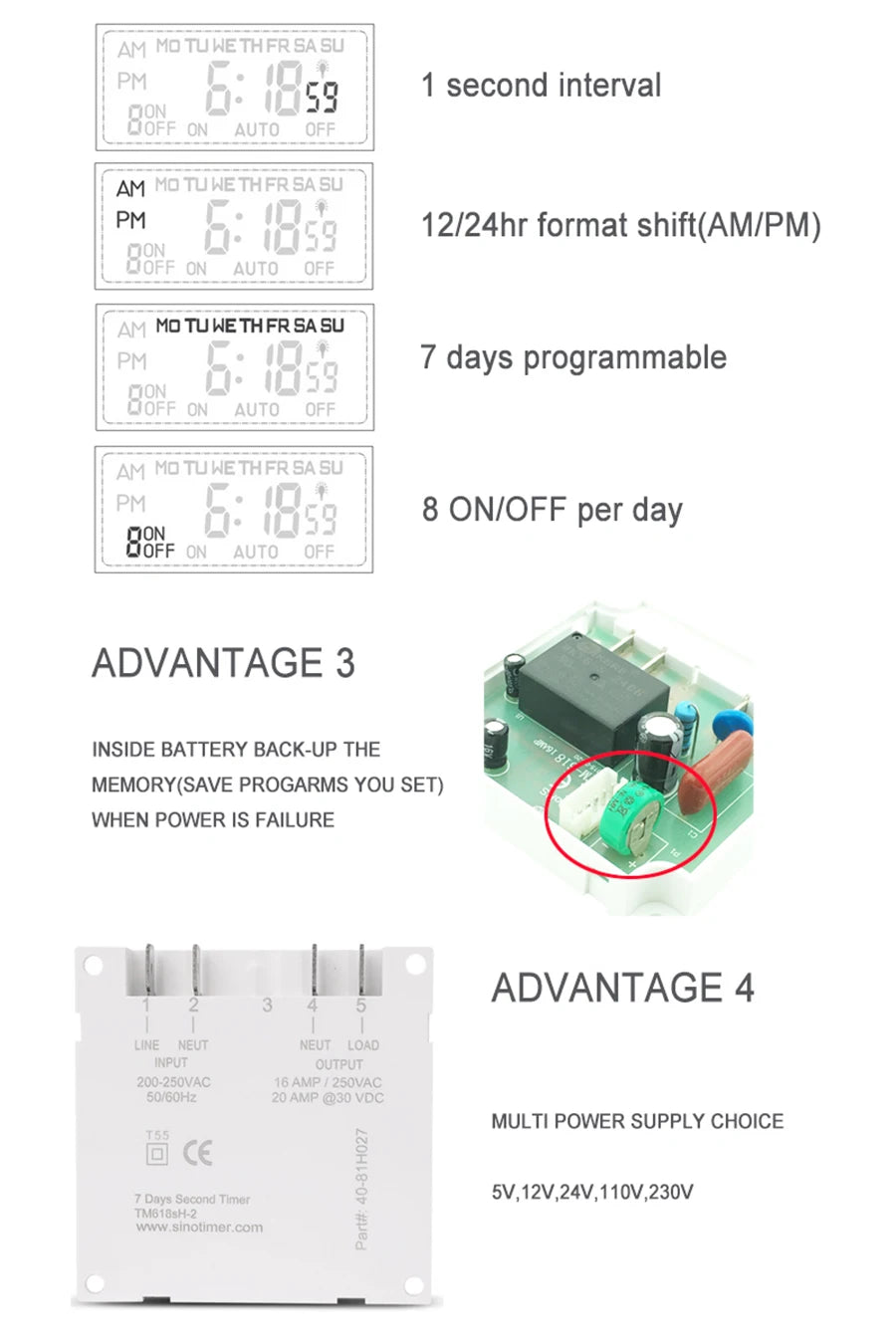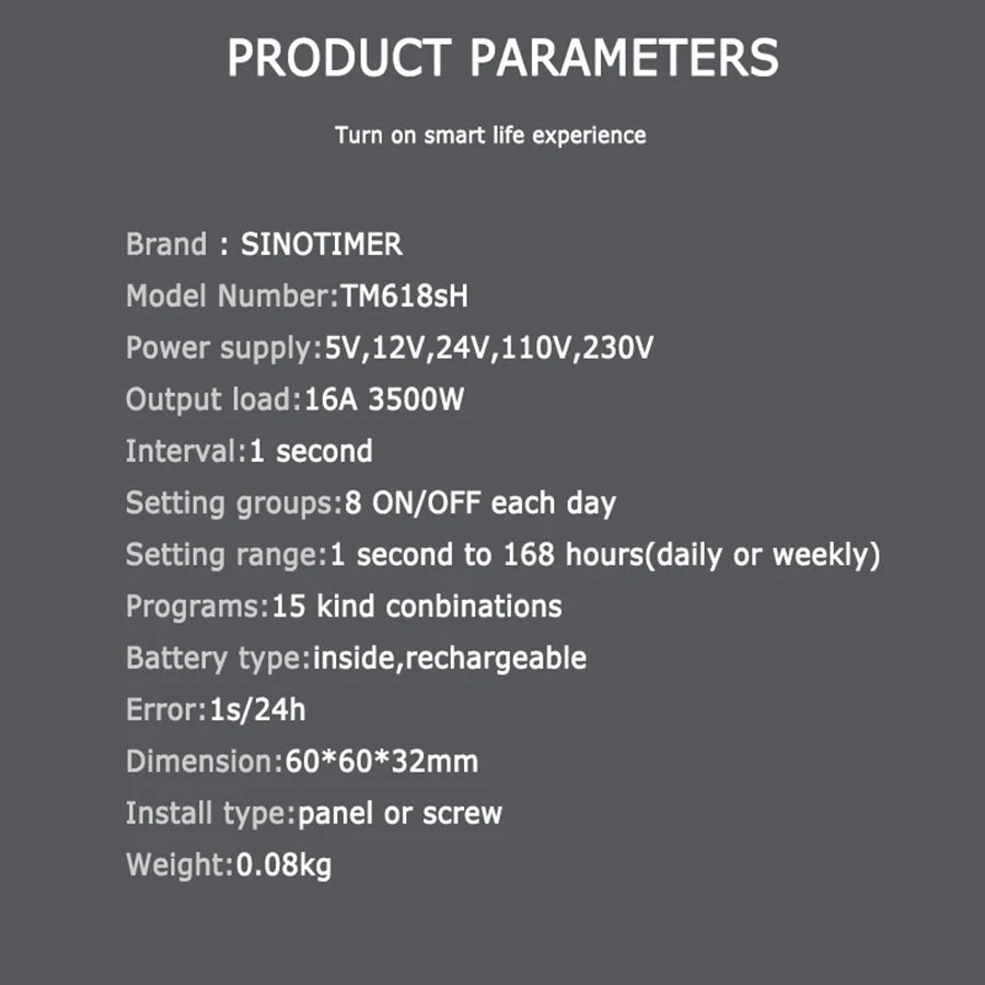 TM618SH 1 Second Interval 5V 12V 24V 110V 220V Digital LCD Timer Switch 7 Days Weekly Programmable Time Relay With Countdown