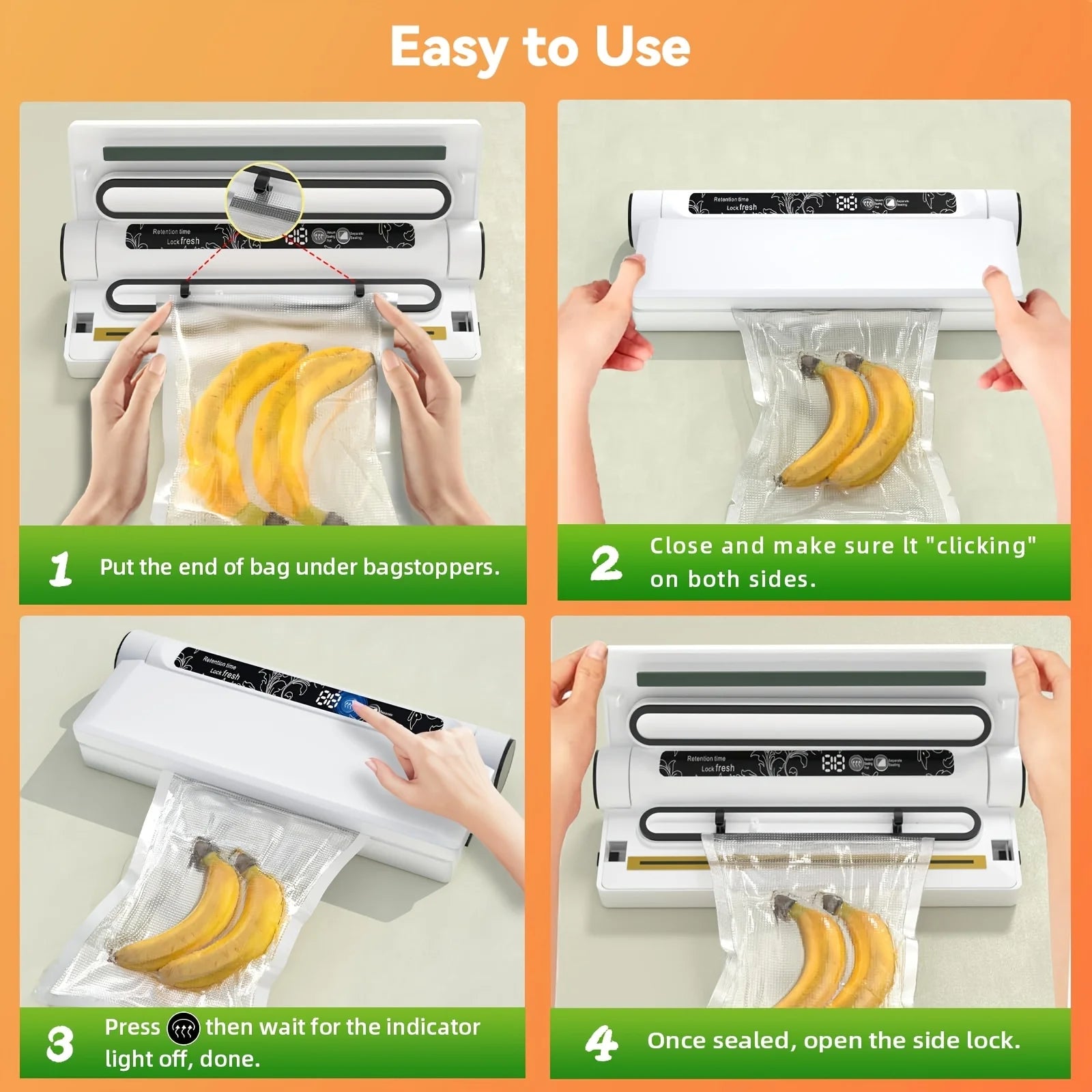 - Schnelle Versiegelungszyklen sparen Zeit beim Vorbereiten von Mahlzeiten oder beim Portionieren für die Lagerung.