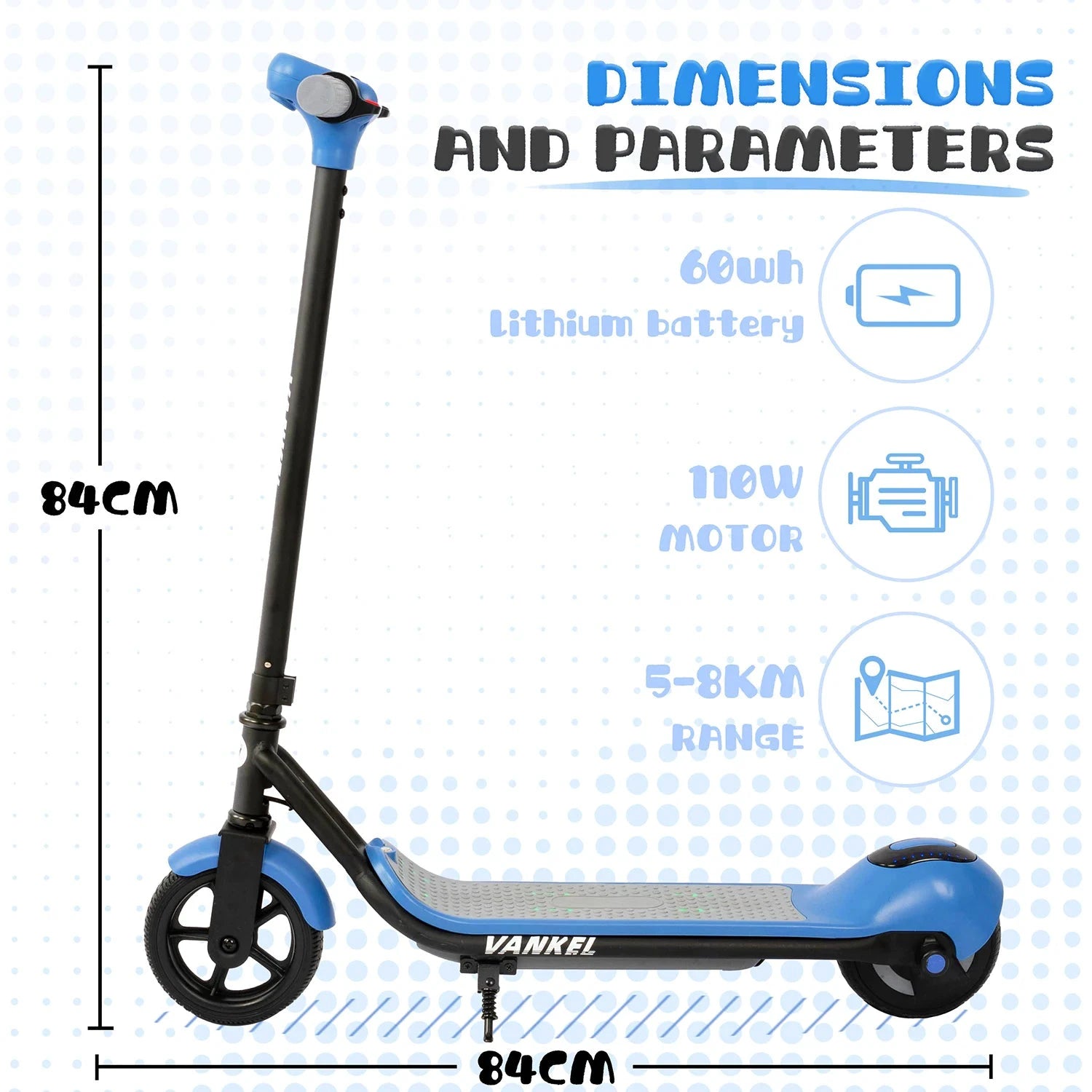 - Der Vankel Elektroroller Kinder 6,5 Zoll Bluetooth Licht Sicherheit setzt auf einen 110-Watt-Motor und eine 24-V-Batterie, wodurch ausreichend Leistung für sichere Geschwindigkeiten bereitsteht.