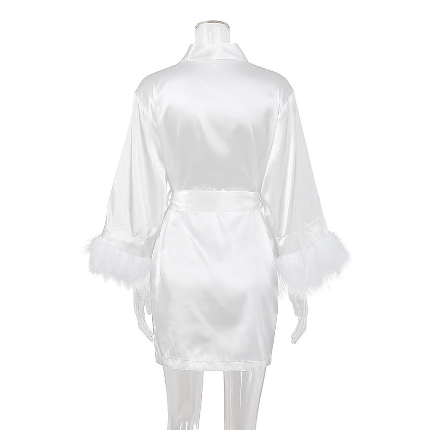 YEGDBDUCN Satin Robe mit Federpelzbesatz – Knielang, Weich