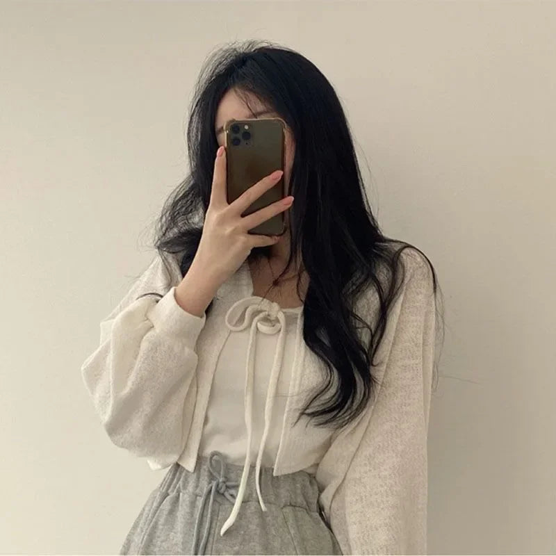 Fipyjip Weiße Sommerstrickjacke Sommerleichtes Knitwear - Regular Fit, Laternenärmel, Leichtes Gewebe — Perfekte Kombination aus Komfort und modernem Streetstyle