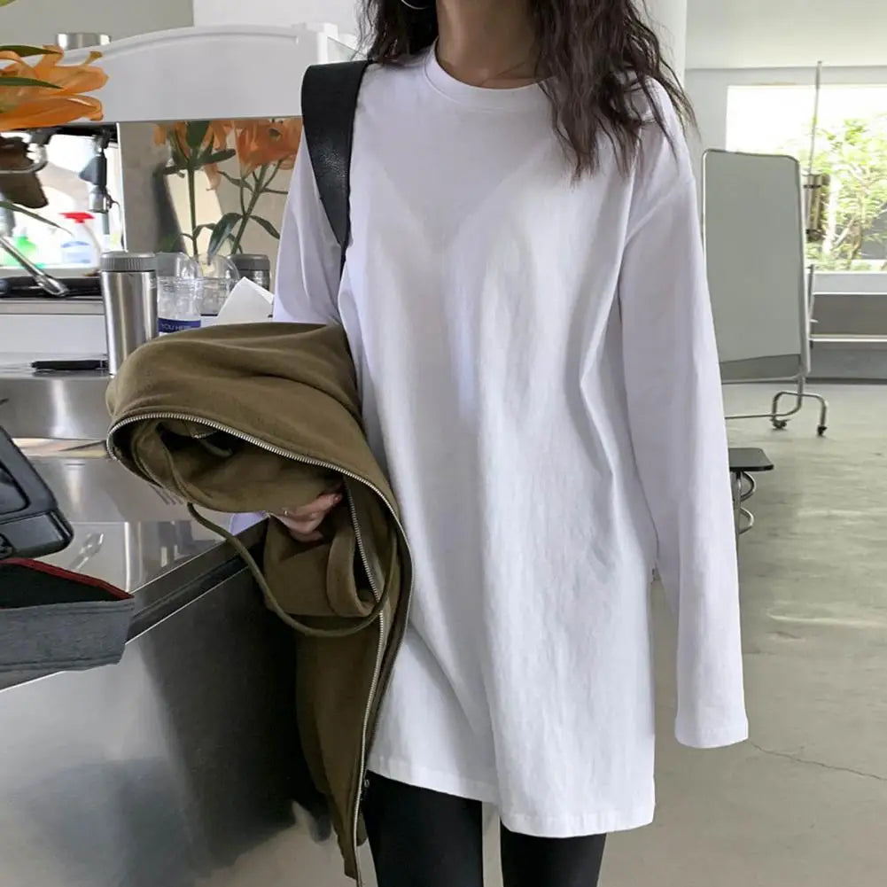 White Women T-shirt Round Neck Loose Long Sleeve Two Side Split Tee Shirt Pullover Spring Autumn Casual Loose t shirt Oversize