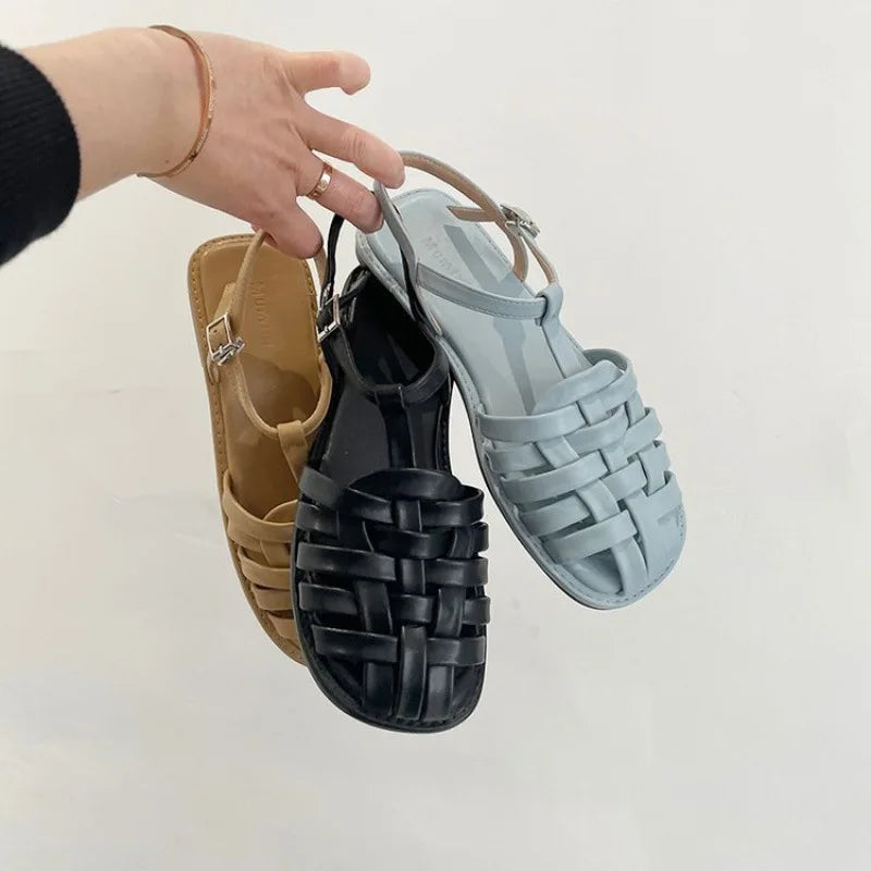 Frauen Flach Römisch Sandalen Sommer Neu Casual Runder Kopf Leicht Rutschfest Gewebt Schuhe Sommer Einfarbig Schnalle Hausschuhe