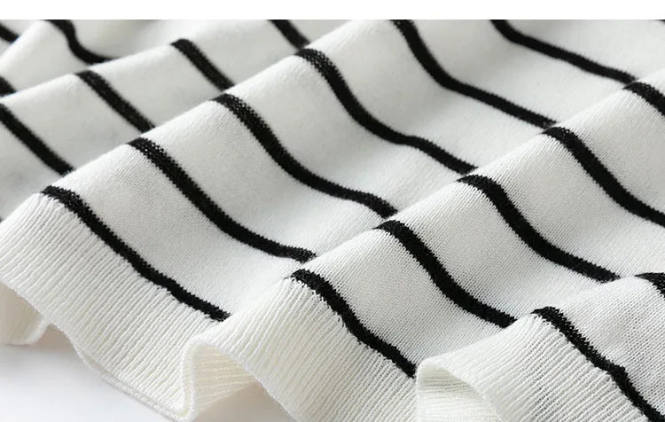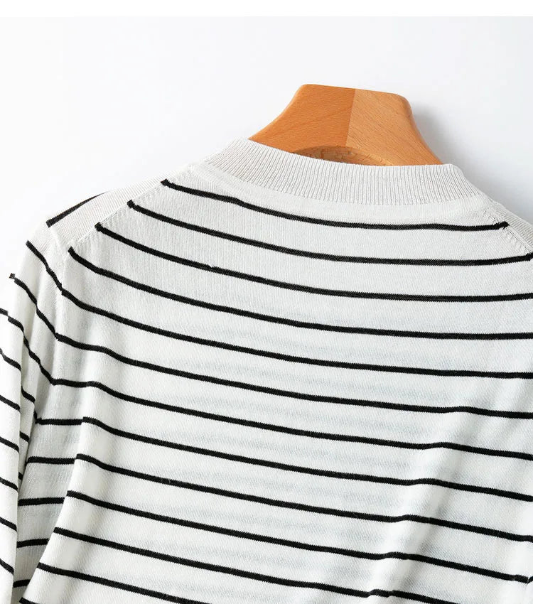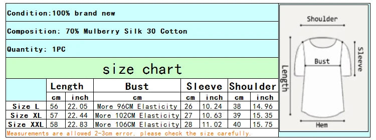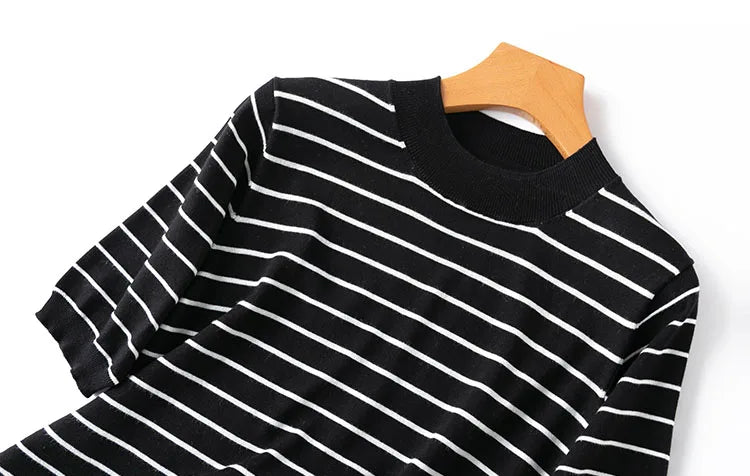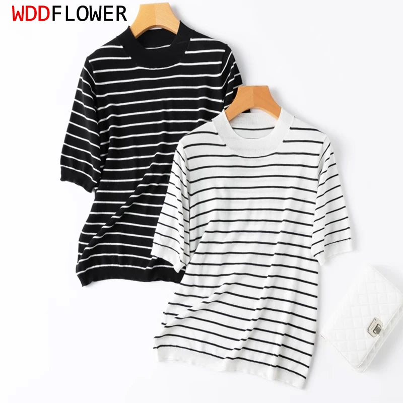 Women Knit T-Shirt 70% Mulberrry Silk 30% Cotton Round Neck Stripes Short Sleeve Sweater Pullover Top Shirt L XL XXL LY040