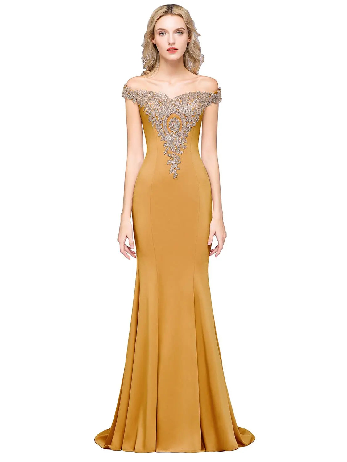 Dieses bodenlange Meerjungfrauen-Kleid kombiniert raffinierte Spitzenapplikationen mit einer schmeichelnden Off-Shoulder-Silhouette, um bei Hochzeiten und Gala-Abenden souveränes Auftreten und hohen Tragekomfort zu bieten.