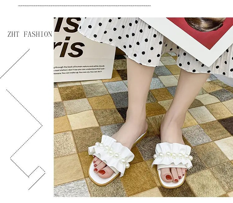 Women Slides Faux Pearl Decor Ruffle Trim Sandals Open Toe Wear-resistant Flat Slippers Summer Sandy Beach Sandals Women Shoes