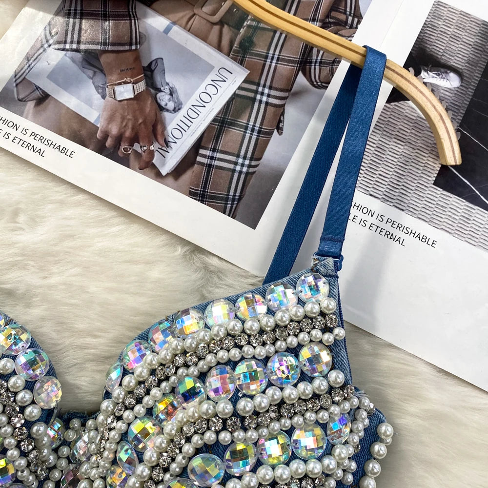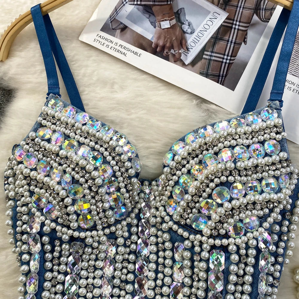 Women Summer Denim Camisole Corset Top Build In Bra Crystal Diamonds Pearl Luxury Jeans Tops High Street Club Party Nightwears