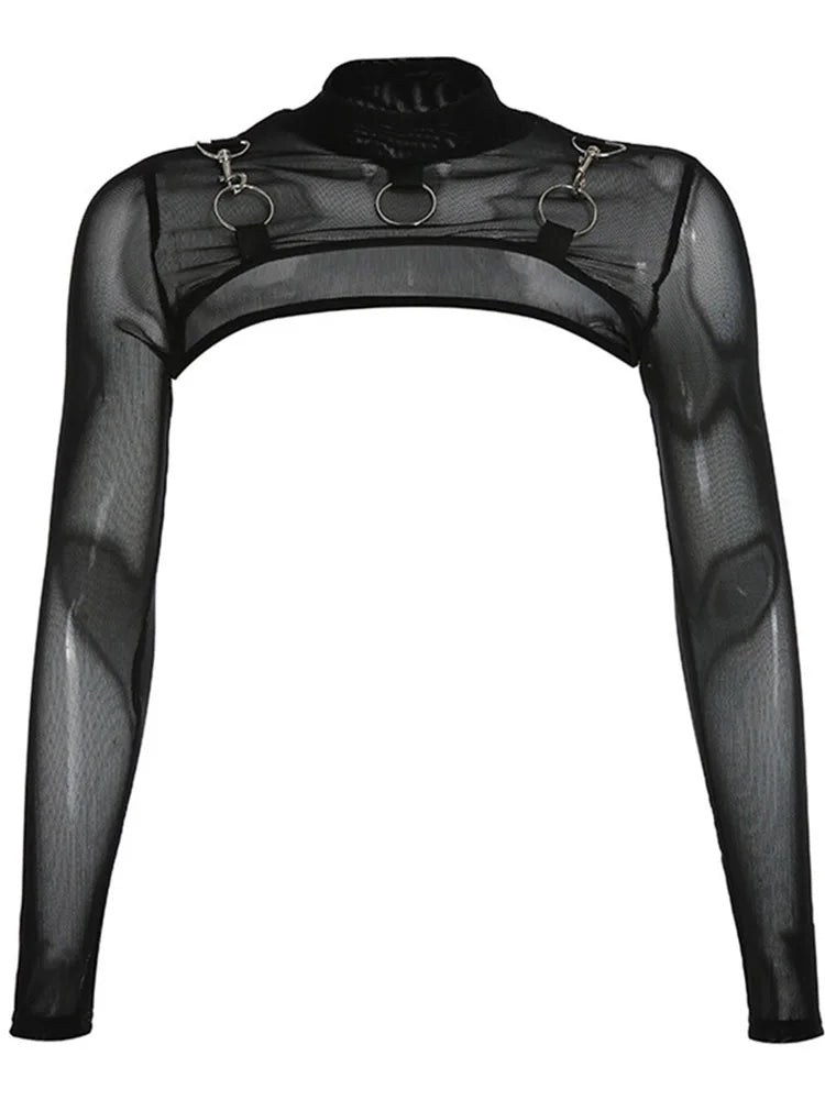 Women T-Shirt elegant Hip Hop Gothic Lady Micro Short Metal Chain Lace See-through Mesh Long Sleeve Turtleneck Hot Tops