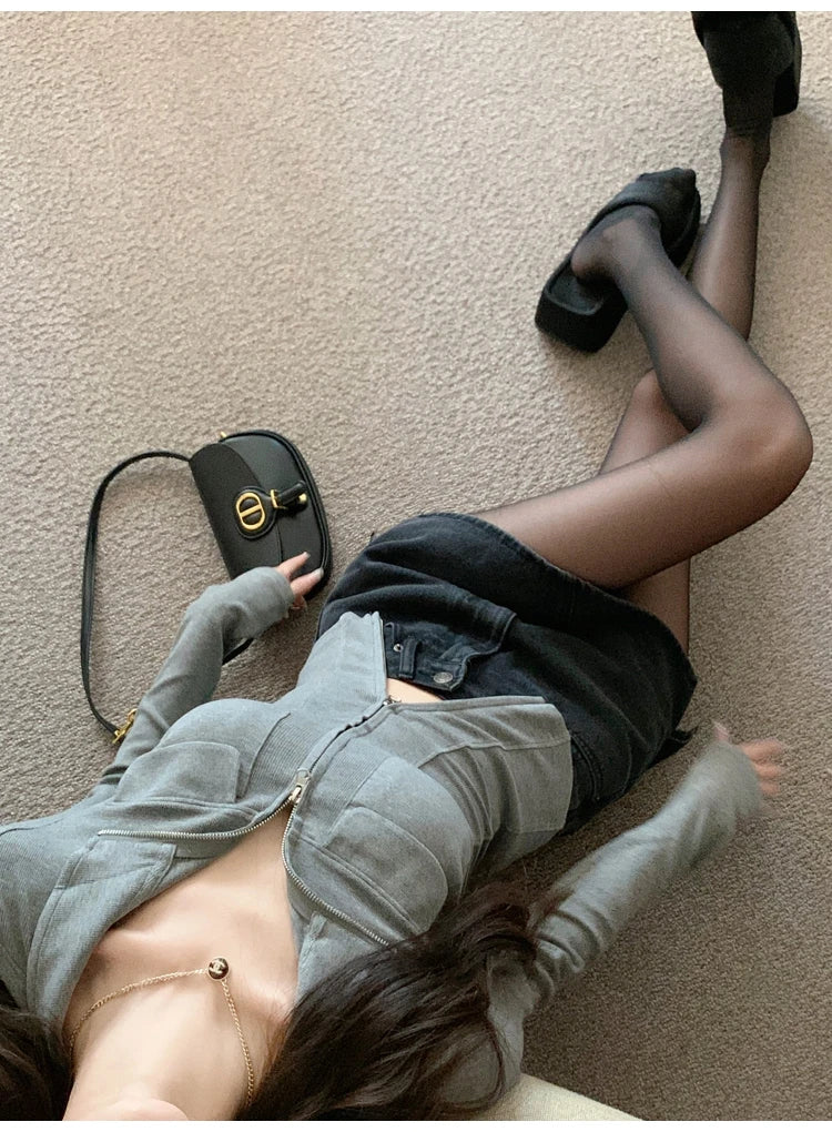 Women T-shirt Spring Autumn Clothes Ribbed Knitted Long Sleeve Short Tops Zipper Design Tee – Eleganter Slim-Fit für Alltag und Büro