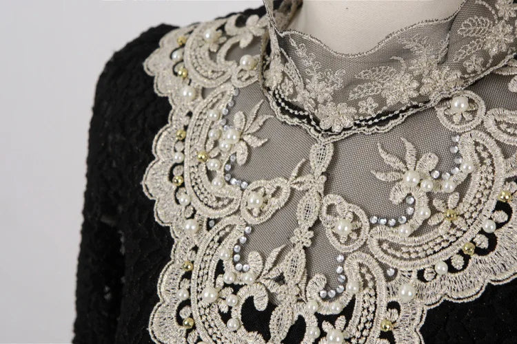 Women T Shirts Vintage Spring Winter Tees Autumn Lace Beads Hole elegant Tops Warm Blouse Top Casual Full Long Sleeve Shirt