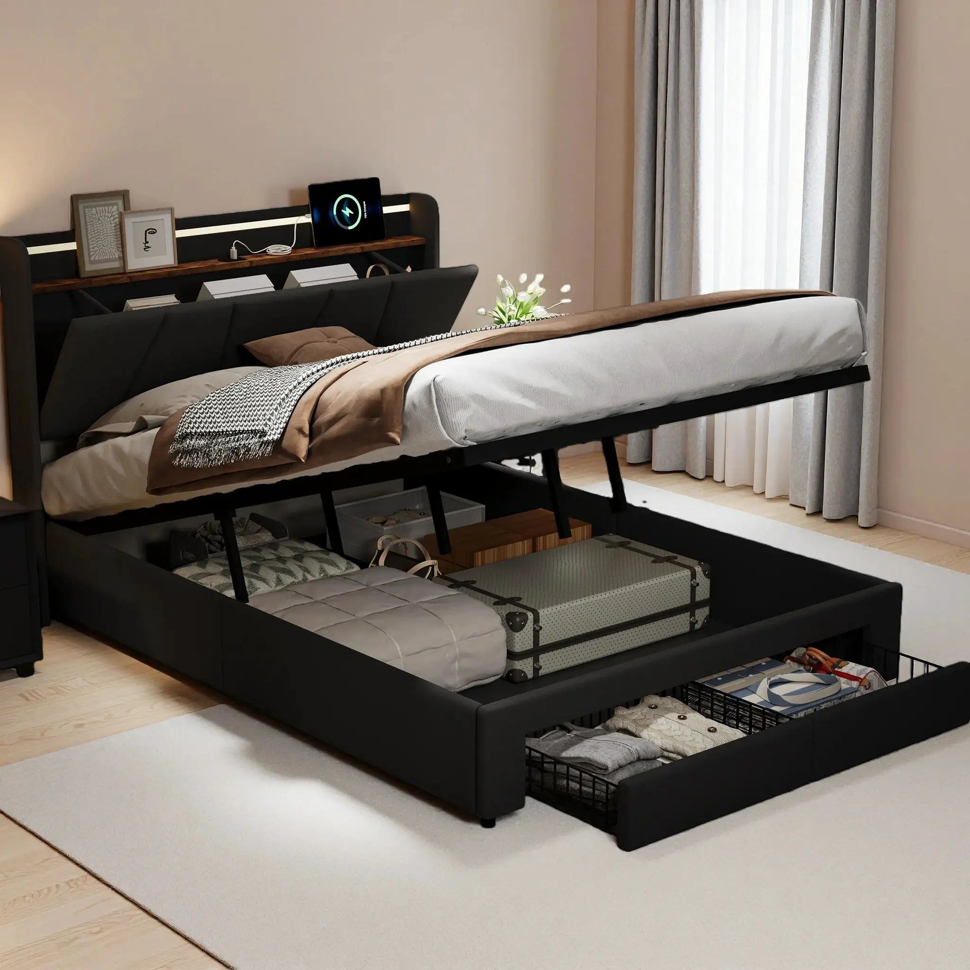 Ihr Bett 140x190cm mit Stauraum, LED-Beleuchtung und ausziehbaren Schubladen – Ordnung, Stil und Komfort in einem einzigen Möbelstück.