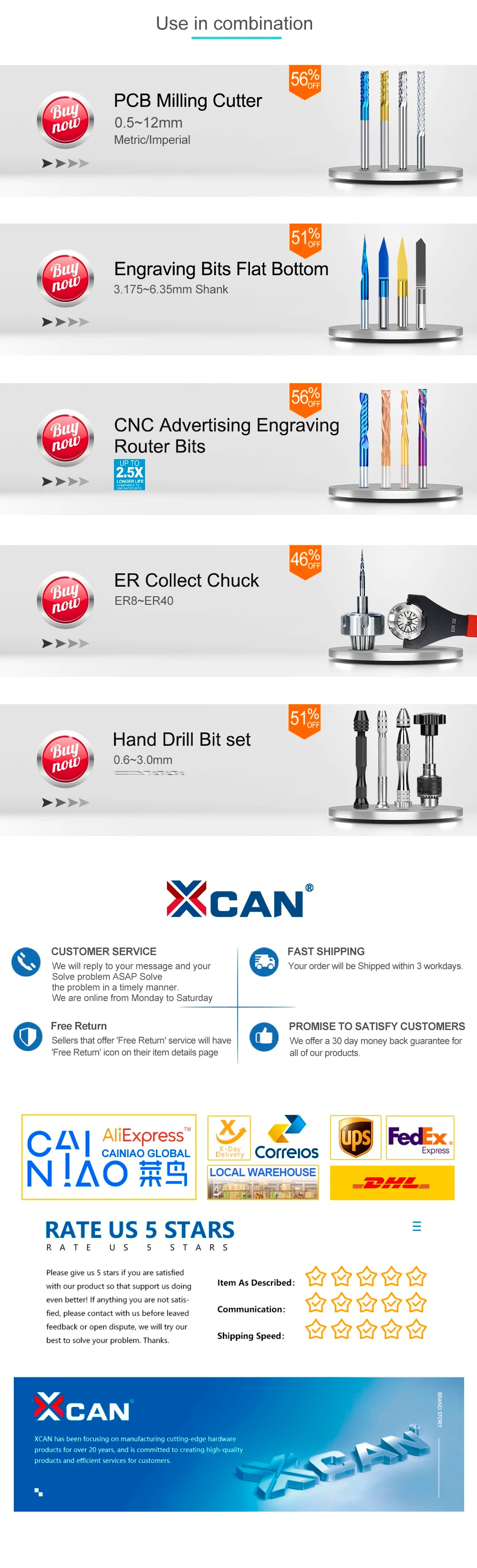 - 10 x XCAN Mini Bohrer Bits (0,3–1,2 mm, jeweils 10 Größen wie oben aufgeführt)