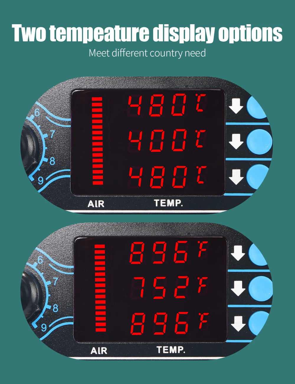 - Heißluft-Temperaturbereich: 100–480 °C