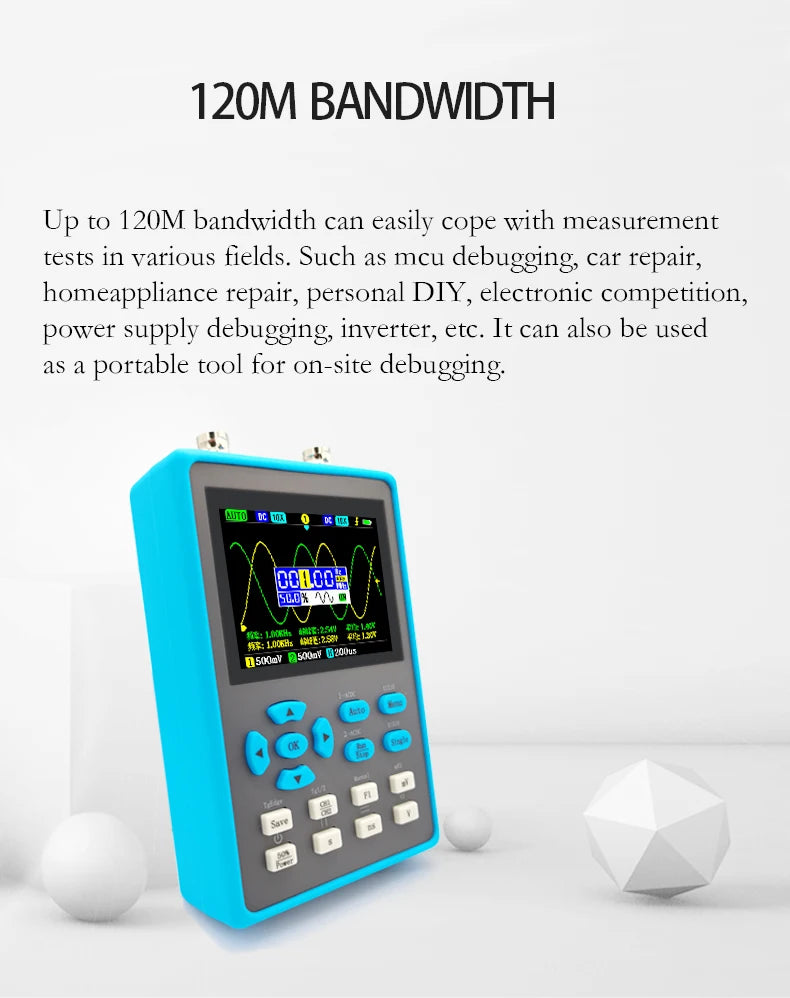 - 120M Bandbreite ermöglicht detaillierte Darstellung schneller Signale und präzise Analyse hochfrequenter Komponenten.