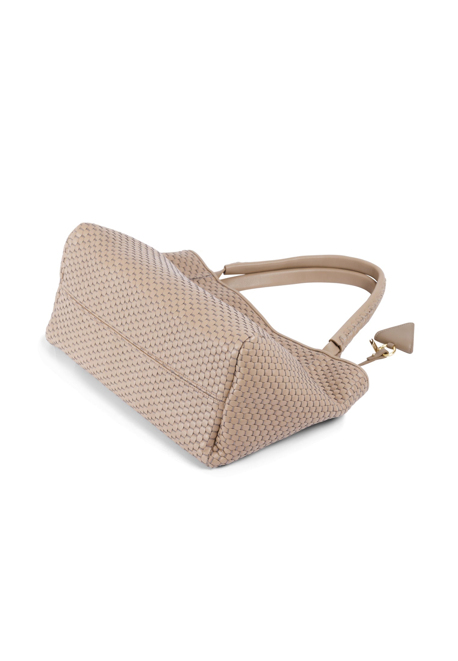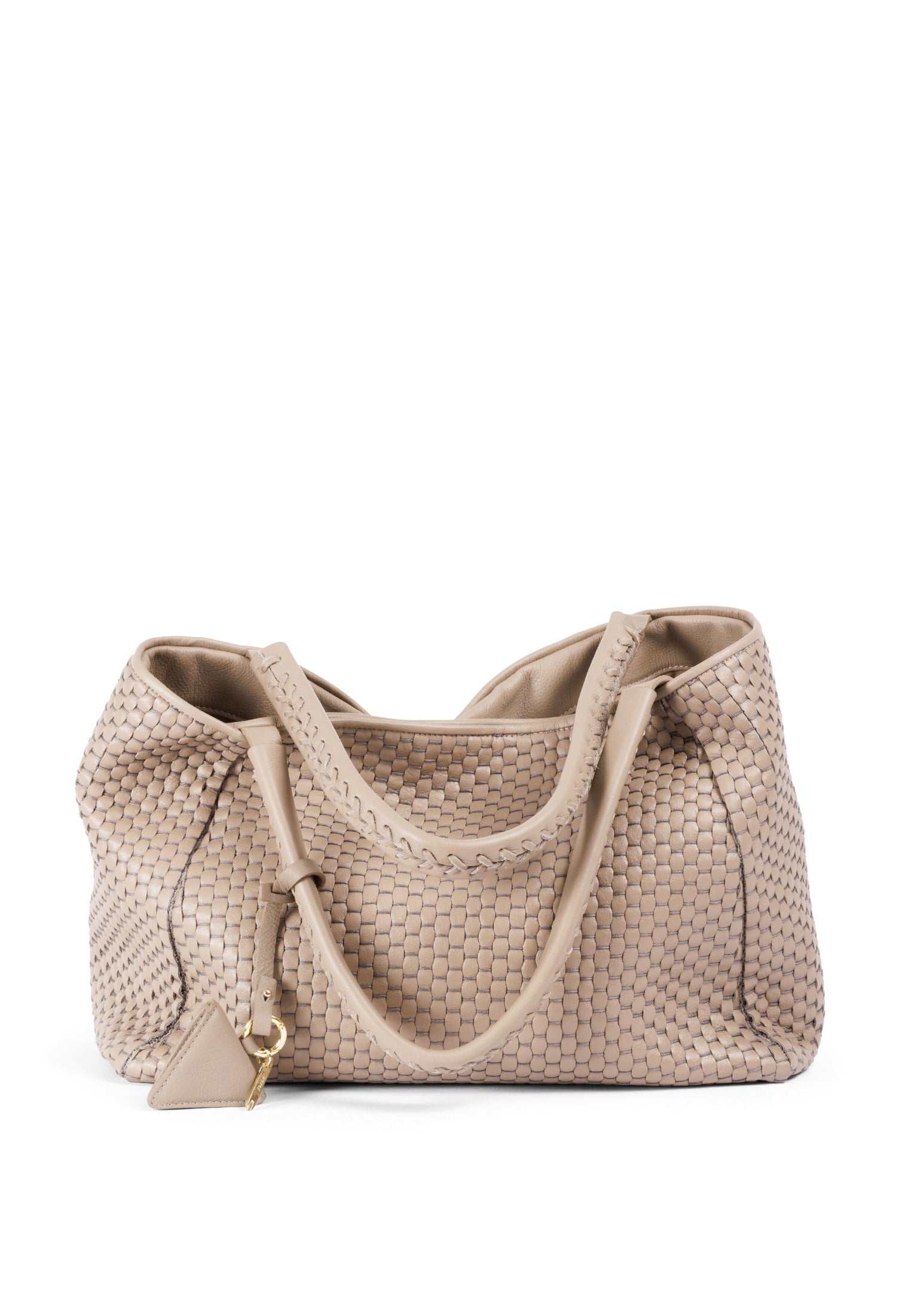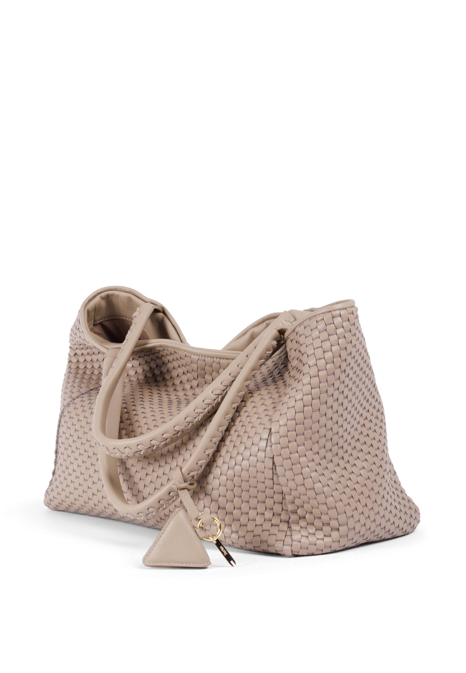 Product: '09' Plain Acacia- Edge without fringes for those who prefer more minimalist designs - Double leather handles that fit easily over coats - Magnetic closure for secure and easy access - Internal zipped pocket and two leather compartments to organise your essentials - White gold colored hardware - Soft and durable 100% cotton lining - Exclusive signature Parise pendant included - Protective dust bag included for lasting beauty - Made in Italy - Premium 100% bovine leather woven with 100% cotton yarn on 18th century treadle looms