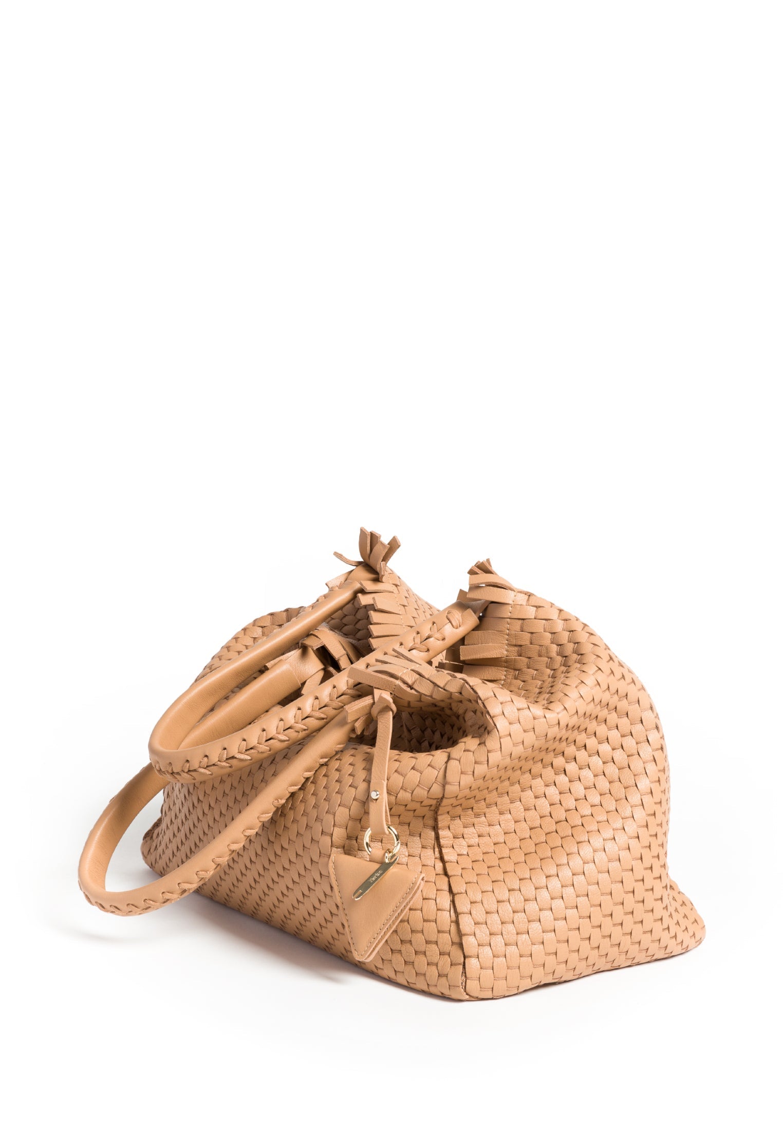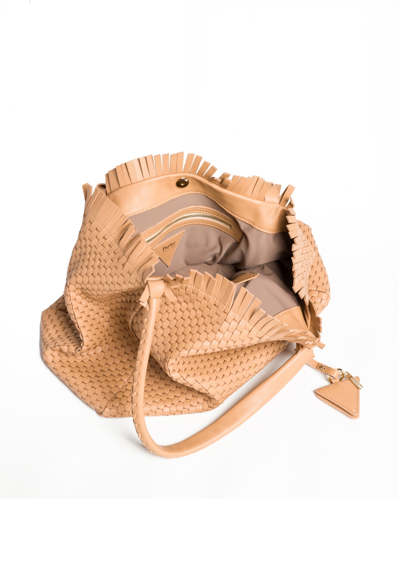 - Signature fringes for a refined, distinctive touch - Double leather handles that fit easily over coats - Magnetic closure for secure and easy access - Internal zipped pocket and two leather compartments to organise your essentials. - White gold colored hardware - Soft and durable 100% cotton lining - Exclusive signature Parise pendant included - Protective dust bag included for lasting beauty - Made in Italy - Premium 100% bovine leather woven with 100% cotton yarn on 18th century treadle looms