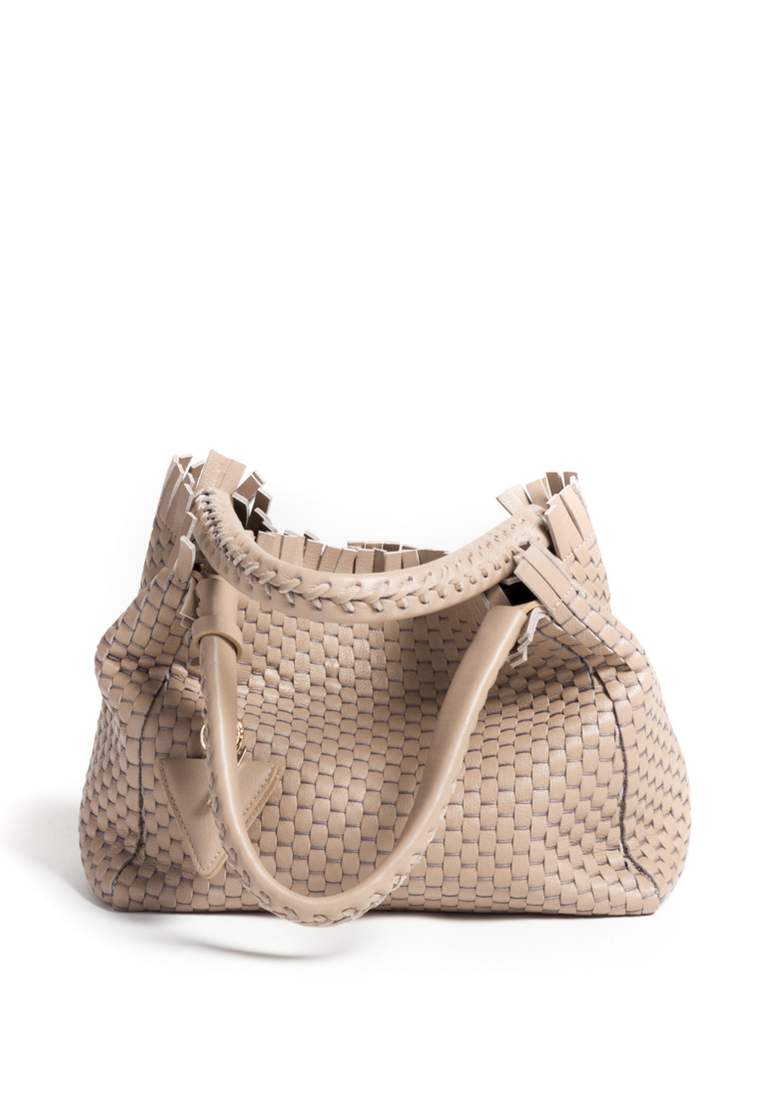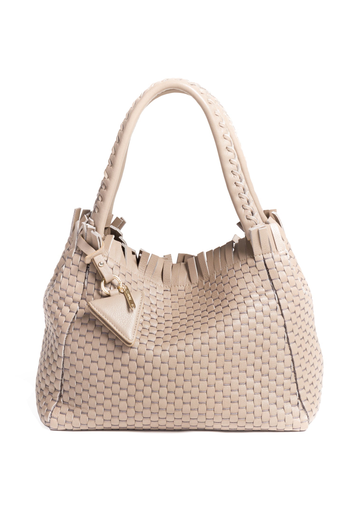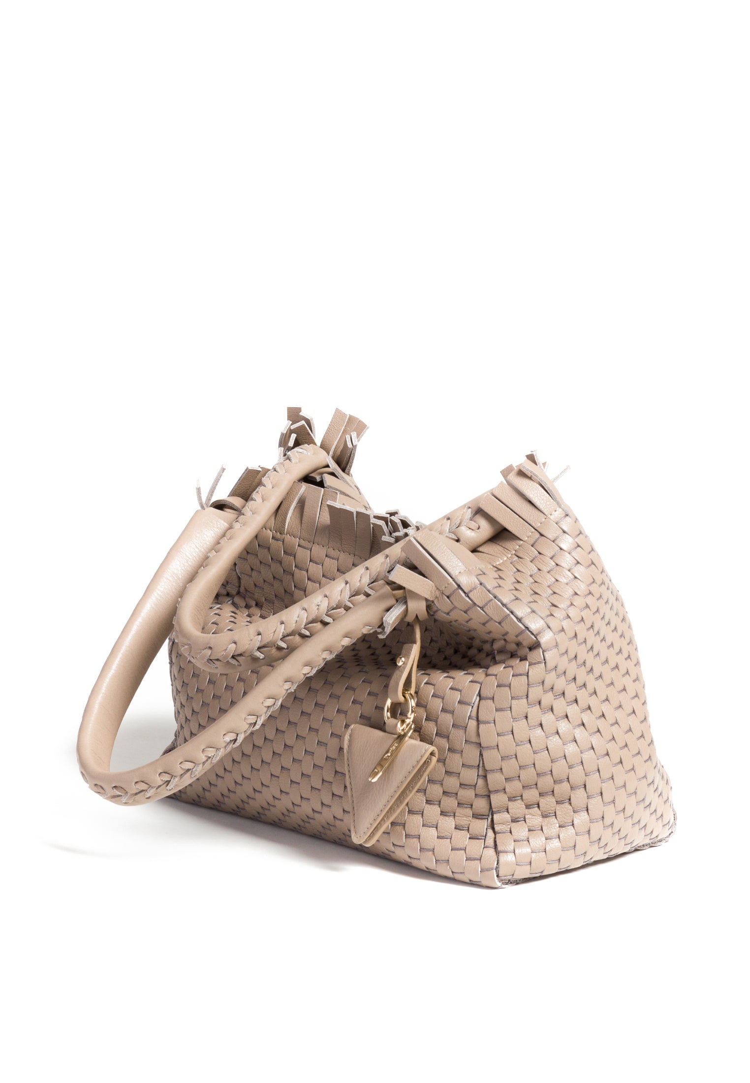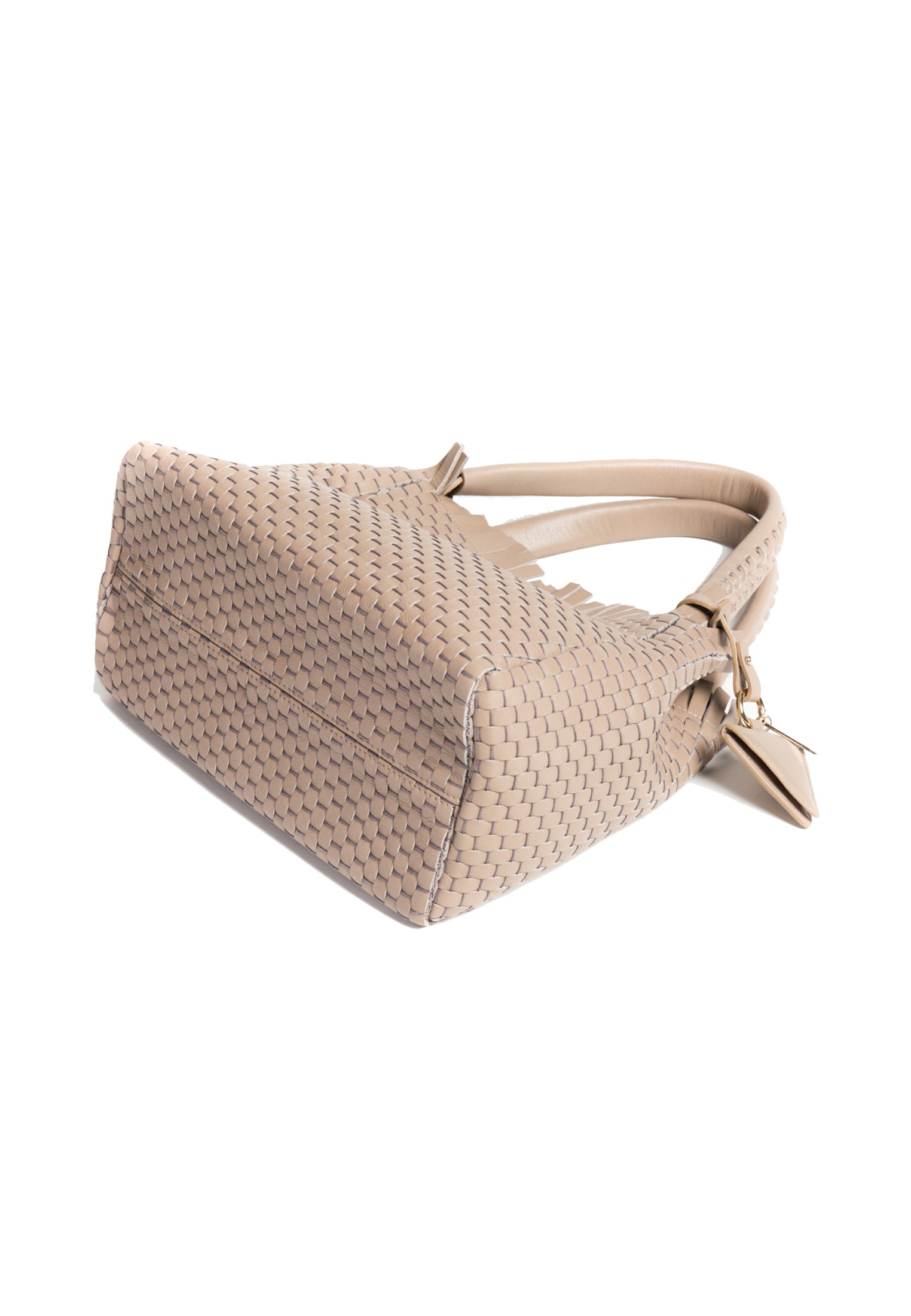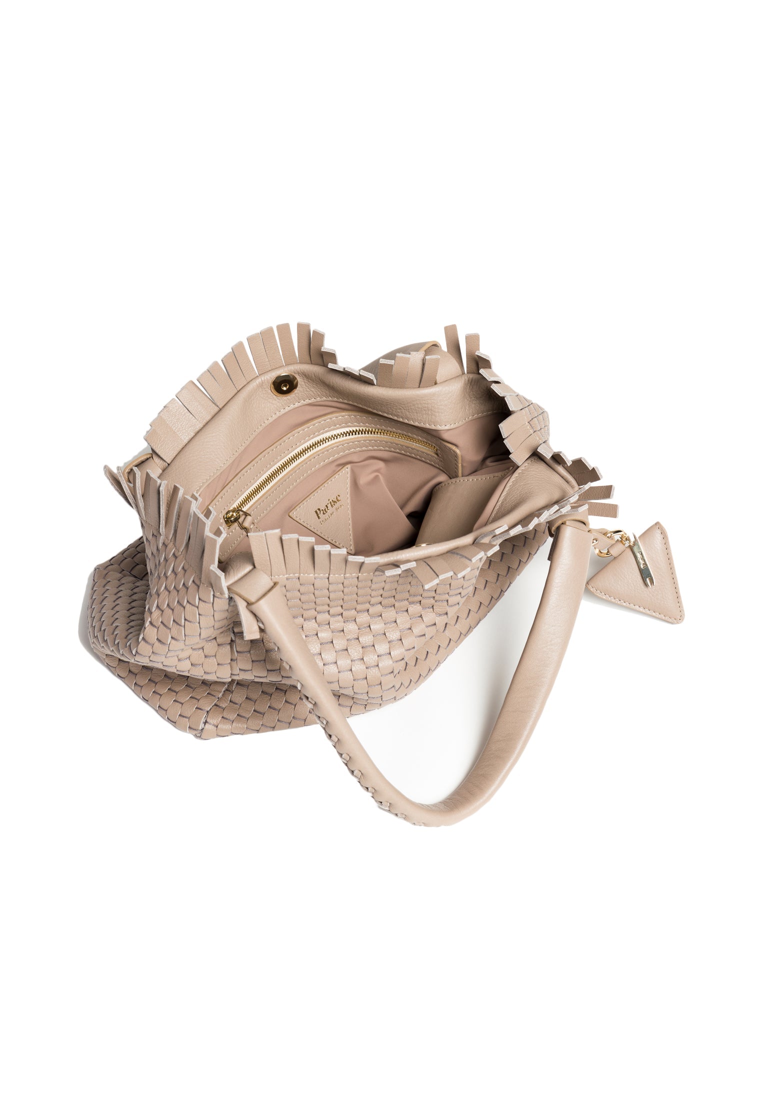 Product: '09' Small Acacia- Signature fringes for a refined, distinctive touch - Double leather handles that fit easily over coats - Magnetic closure for secure and easy access - Internal zipped pocket and two leather compartments to organise your essentials - White gold colored hardware - Soft and durable 100% cotton lining - Exclusive signature Parise pendant included - Protective dust bag included for lasting beauty - Made in Italy - Premium 100% bovine leather woven with 100% cotton yarn on 18th century treadle looms