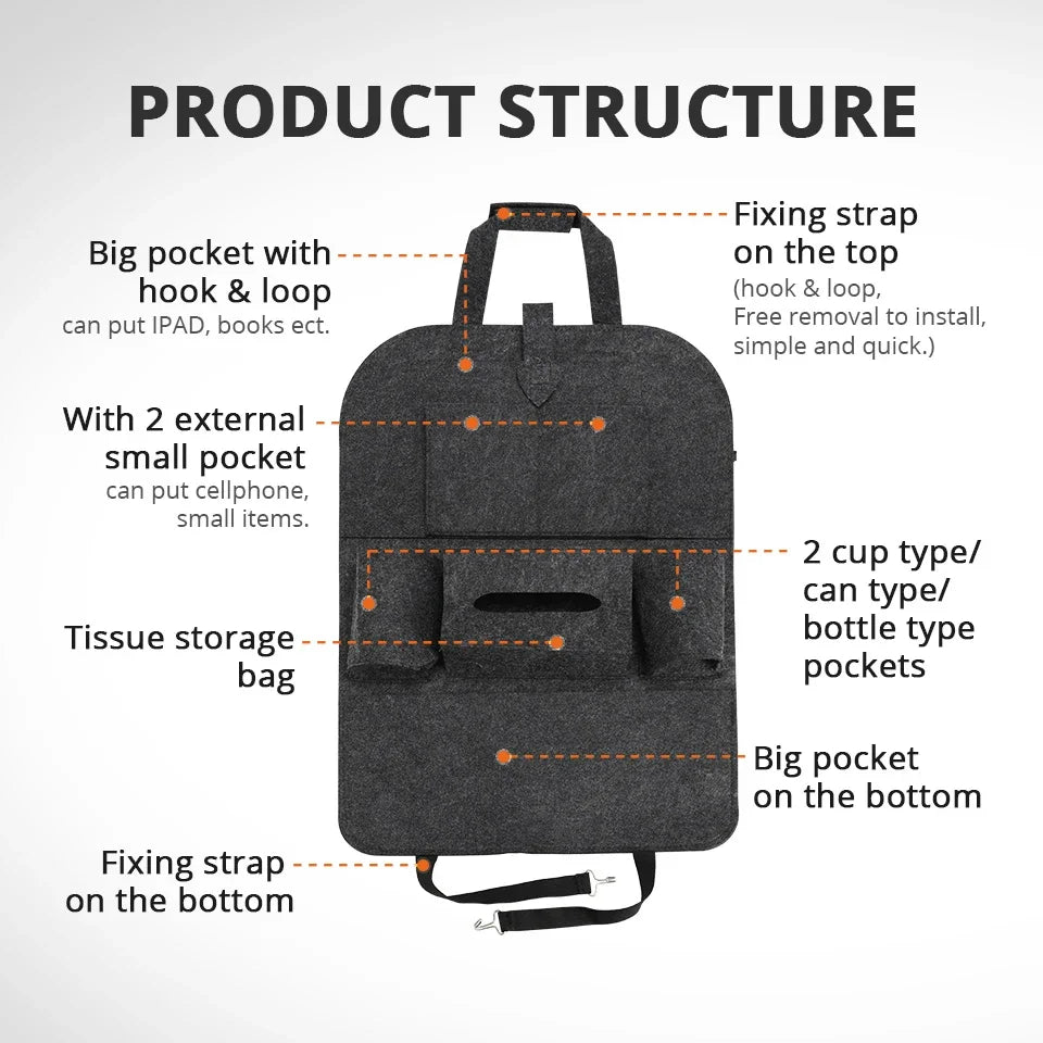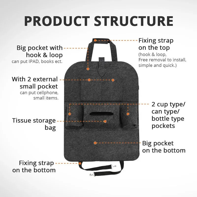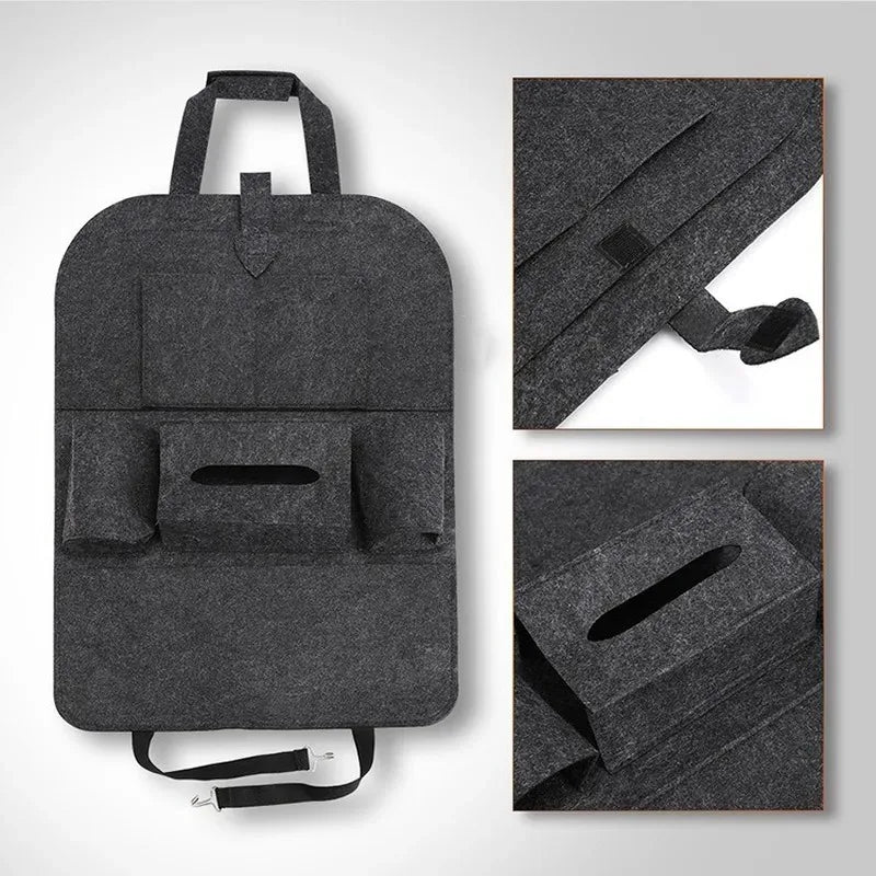 Organizator practic din fetru cu 6 buzunare pentru bancheta din spate: oferă acces rapid la obiectele de la volan, protejează interiorul și optimizează ordinea în vehicul.