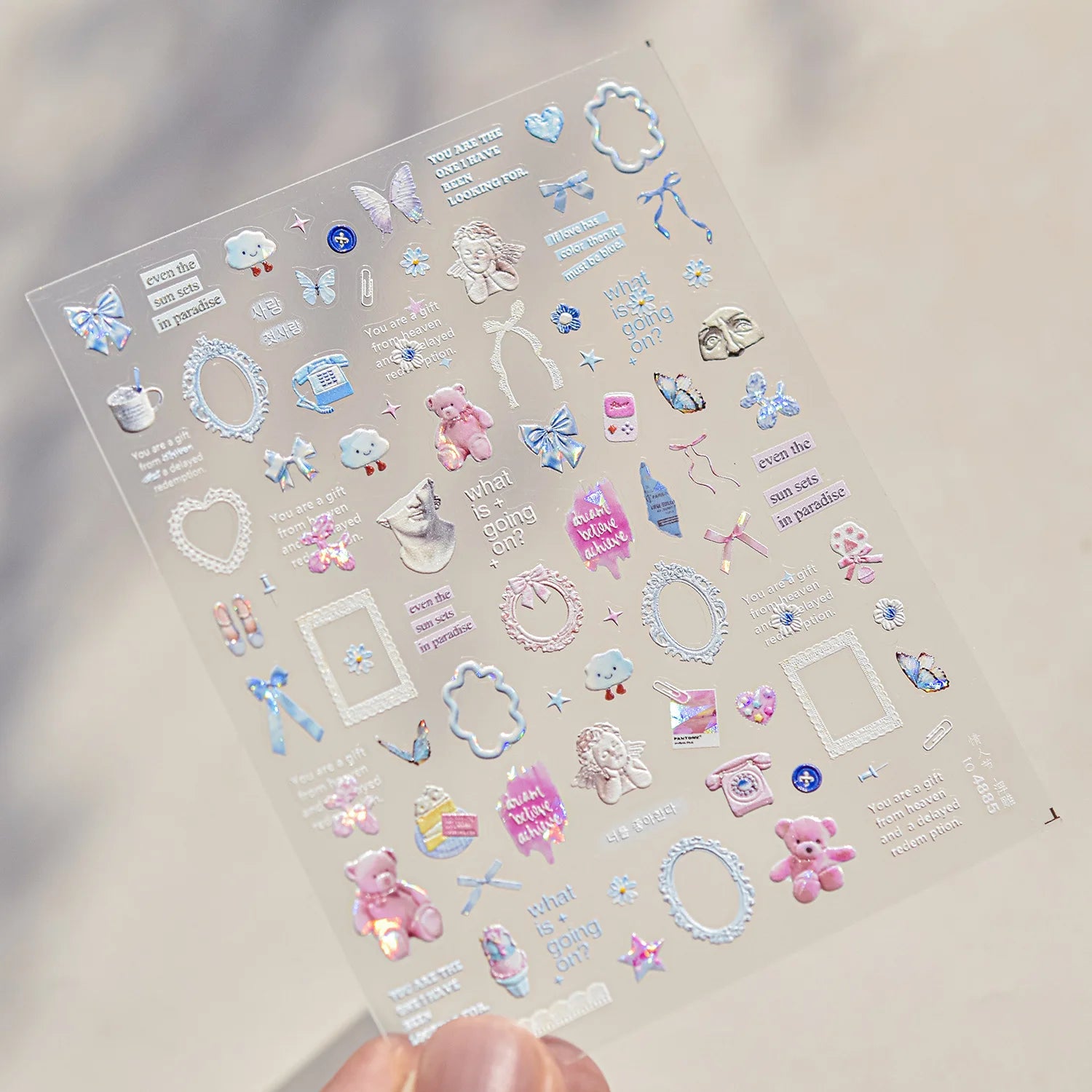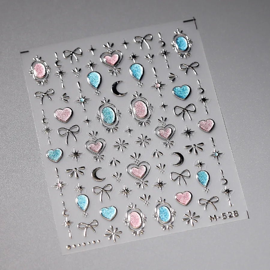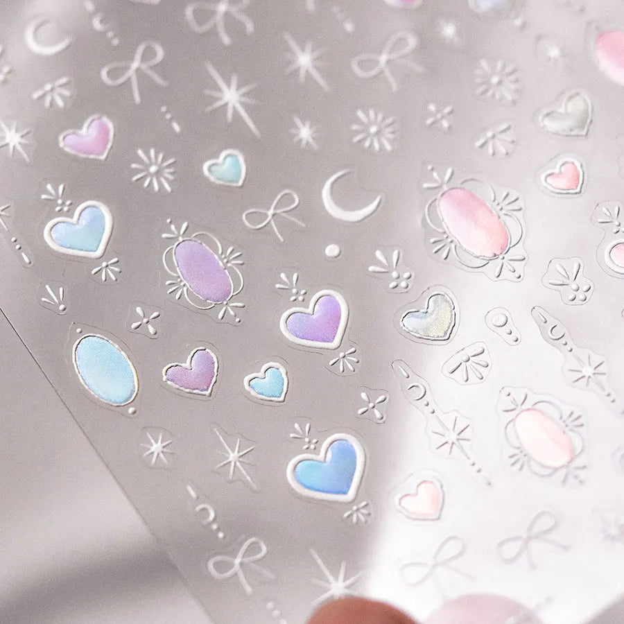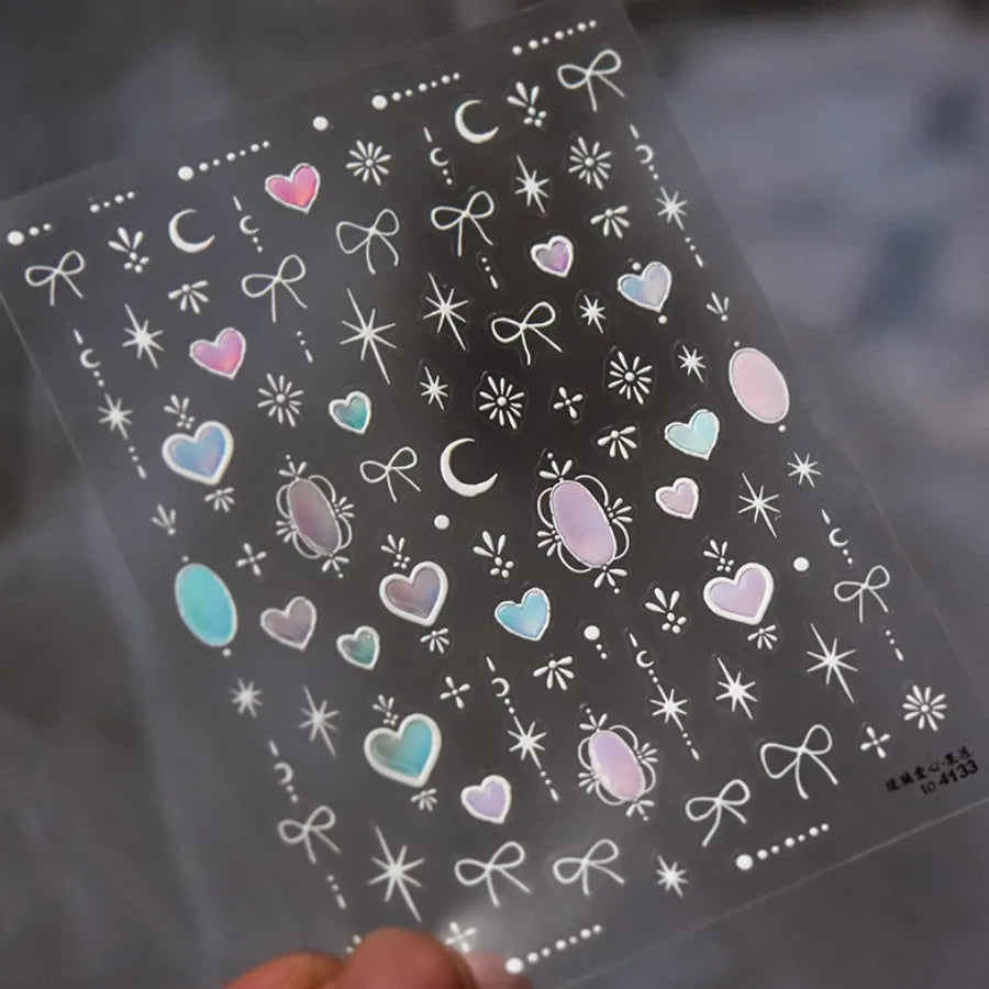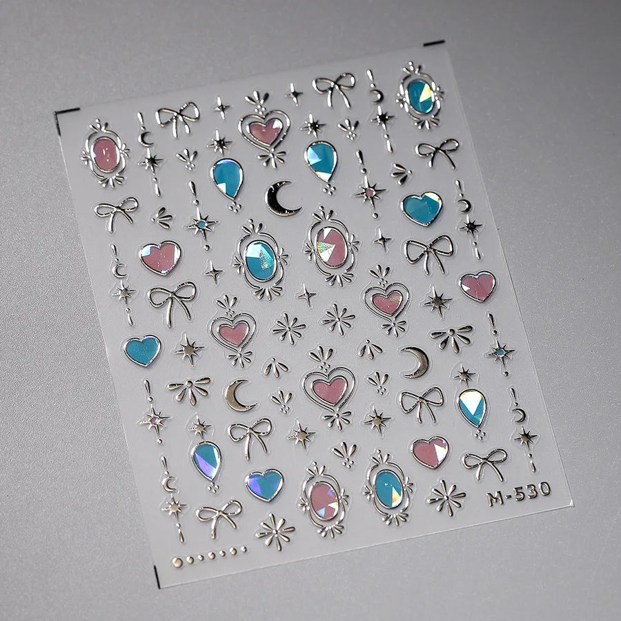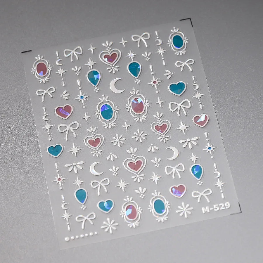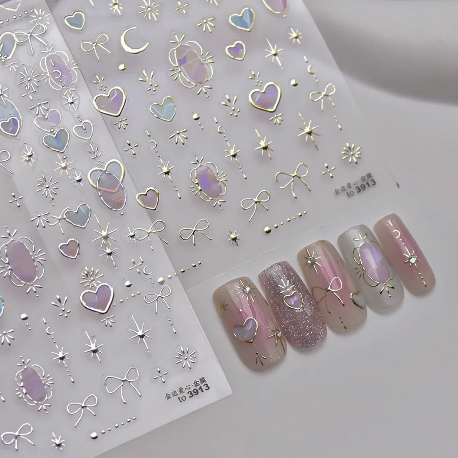 - Tip produs: Autocolante pentru unghii 5D Shell Light cu bordură aurie și motive decorative (inimă, lună, stea, fundițe)