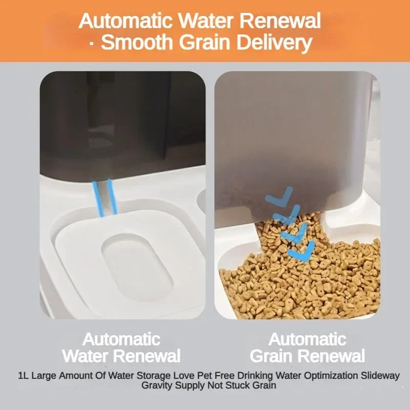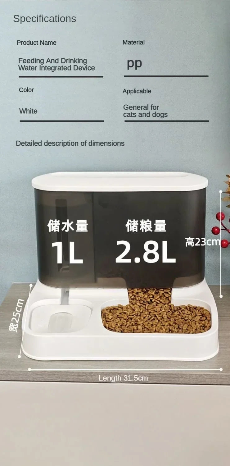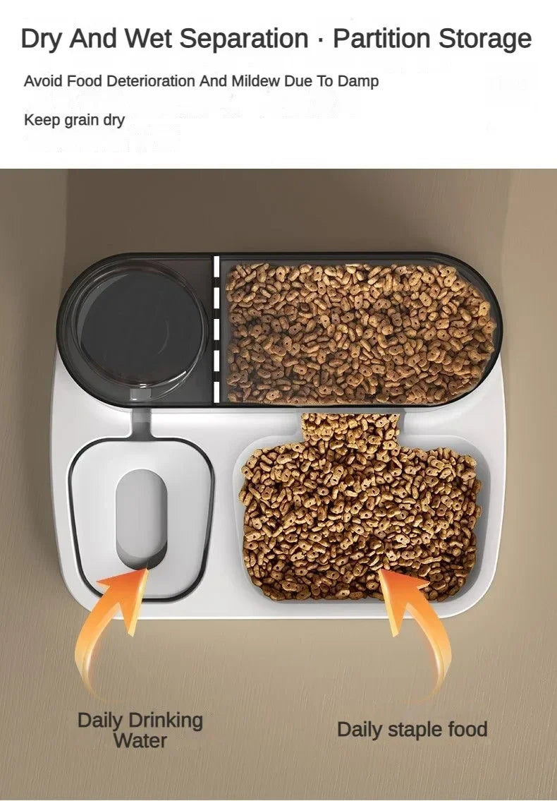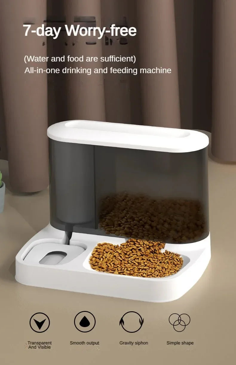 Soluție inteligentă 2 în 1: depozitare automată a alimentelor combinată cu o fântână de băut vizibilă pentru hrănirea continuă a câinilor și pisicilor fără efort zilnic.