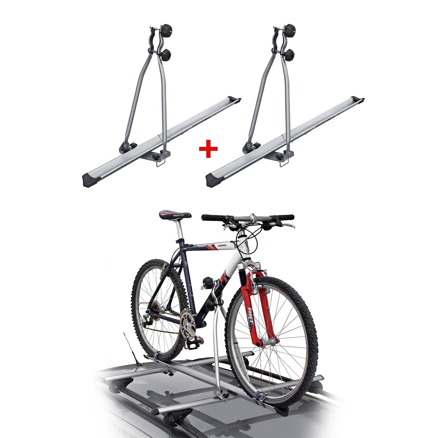 2x Suporturi de biciclete Menabo Huggy până la 15 kg, omologate ABE, suporturi de biciclete pentru acoperiș din oțel