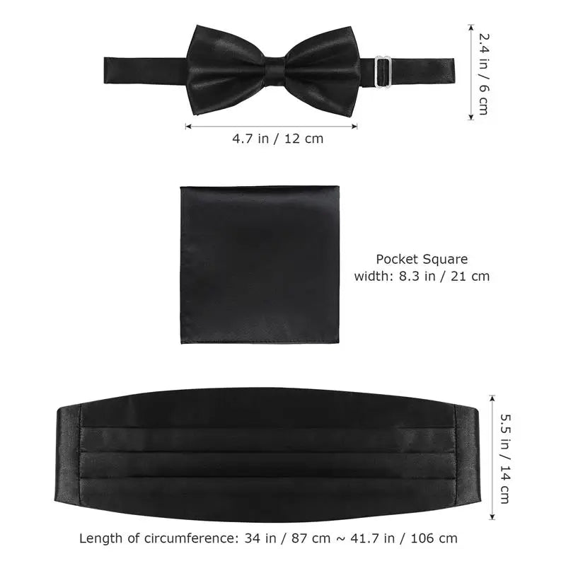 - Design armonios: Papionul, brâul și batista de buzunar sunt asortate în culori pentru un aspect elegant și uniform.