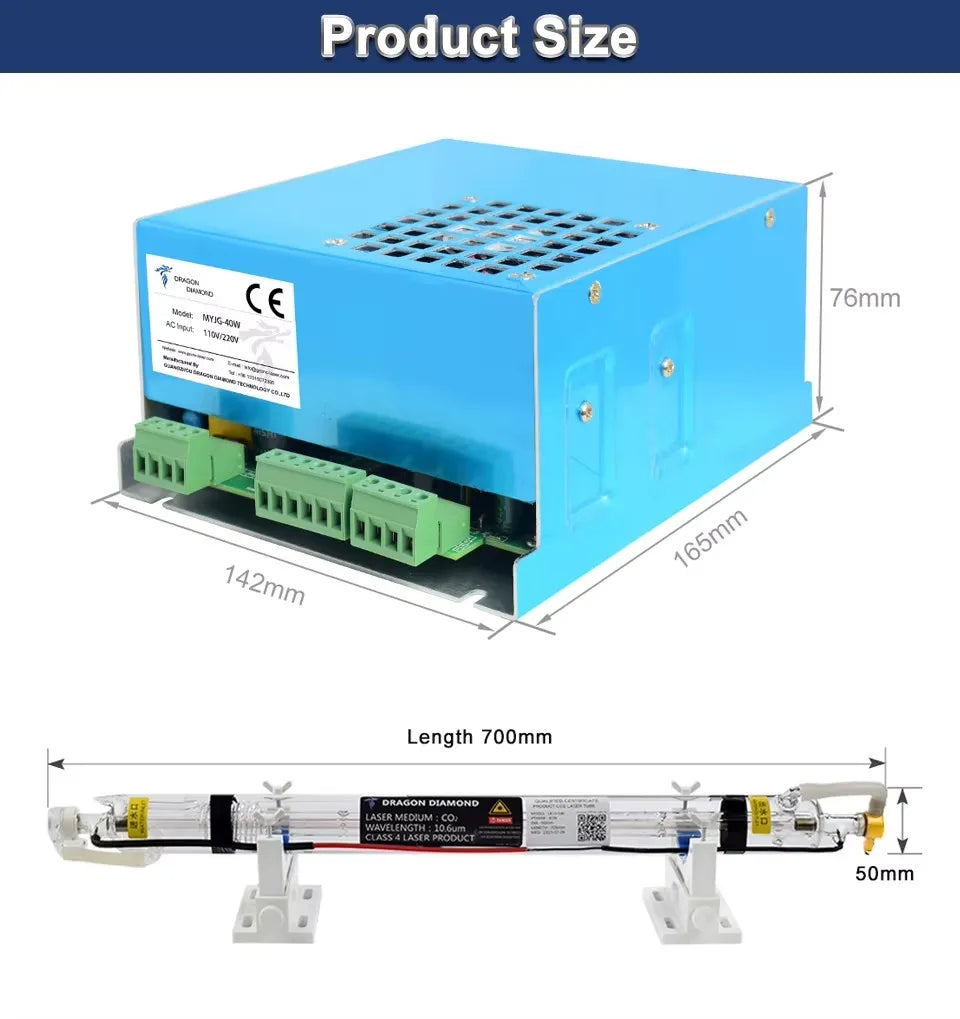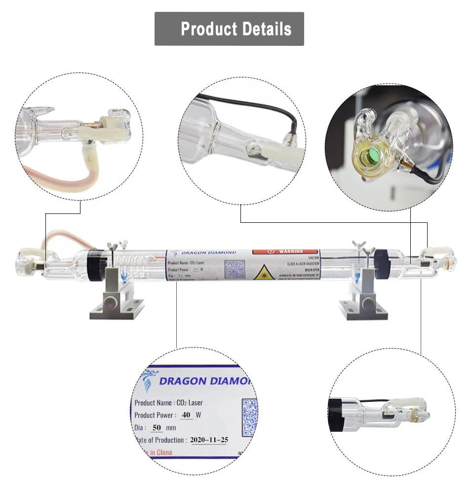 Tub laser CO2 Dragon Diamond, răcire cu apă - 40W, 50mm, 700mm – Gravură precisă și tăiere puternică