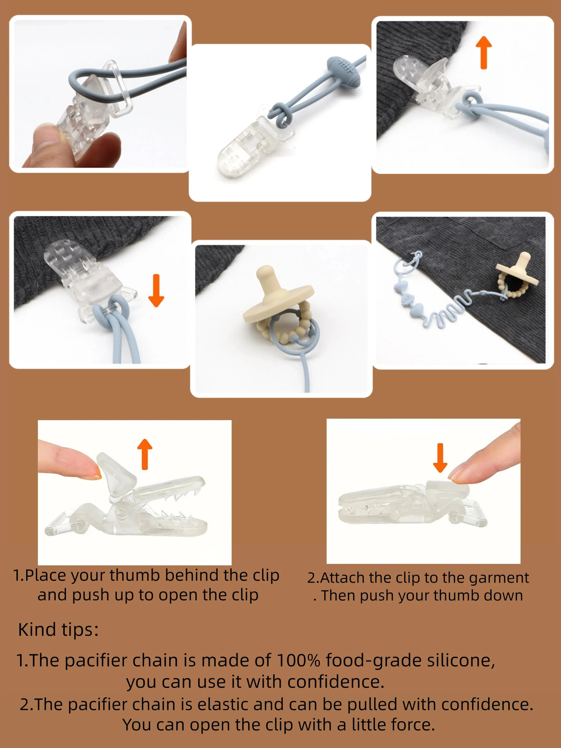 - Clemele robuste asigură o fixare fermă pe haine sau bavete, astfel încât suzetele sau inelele de dentiție să nu se piardă.