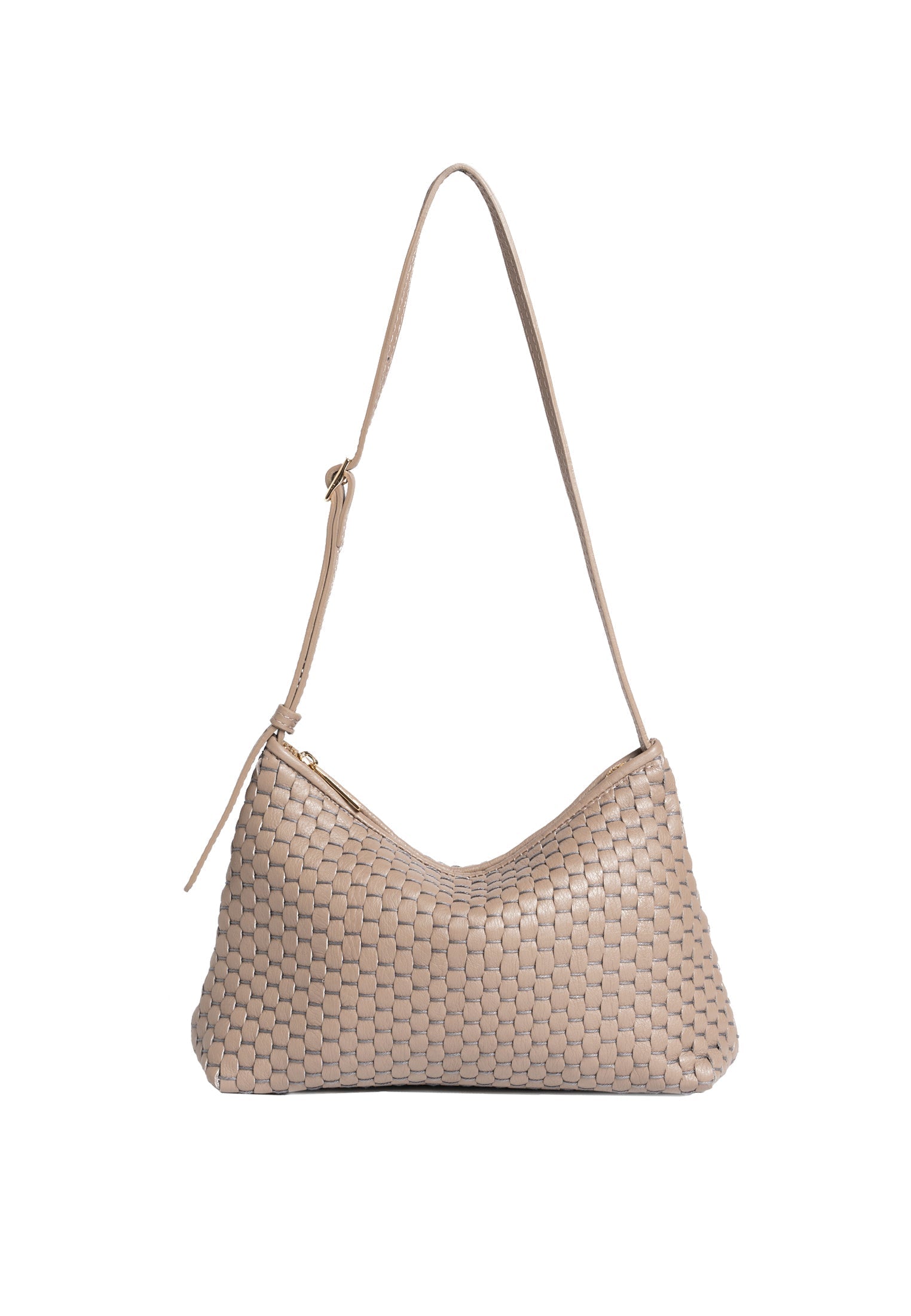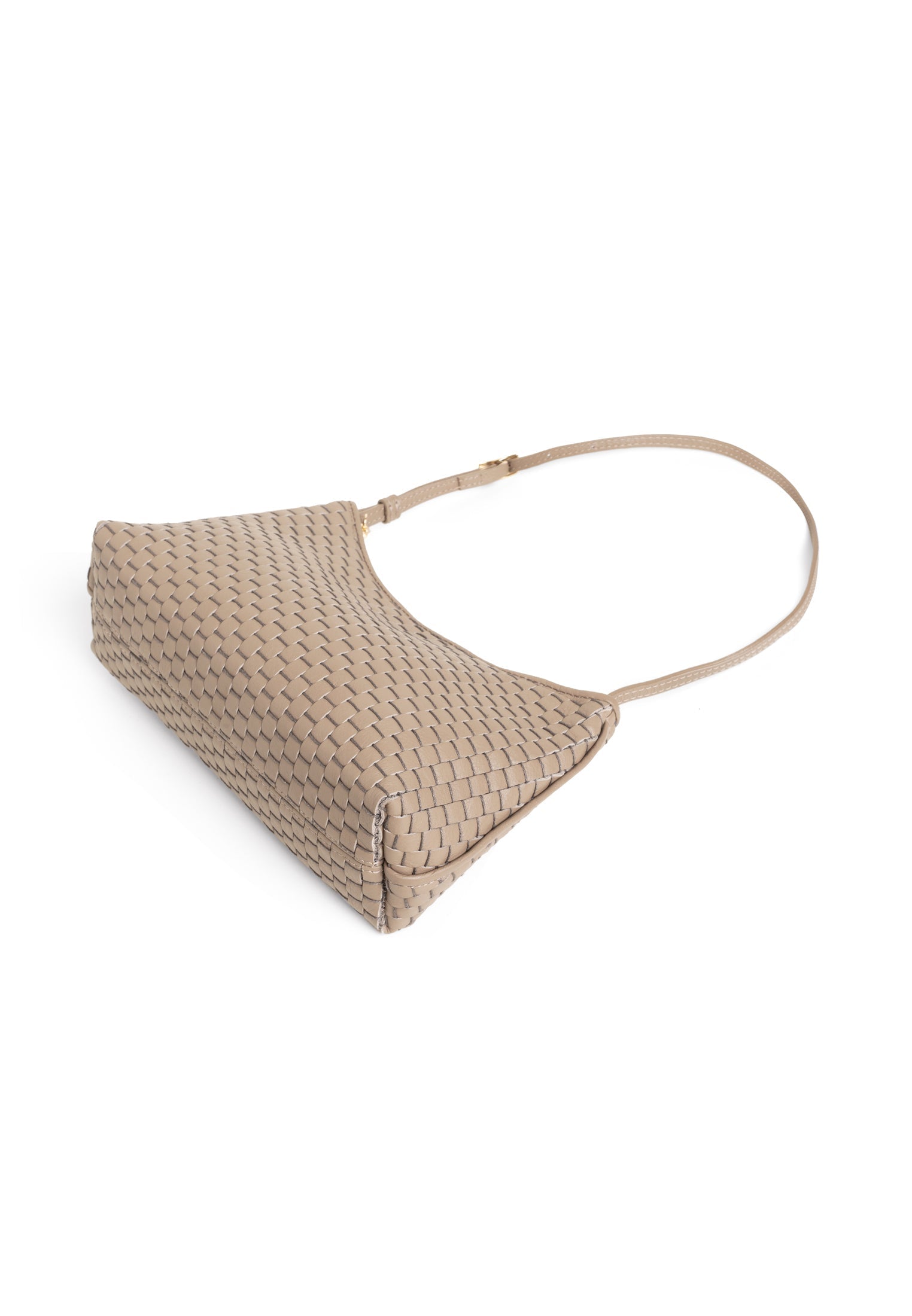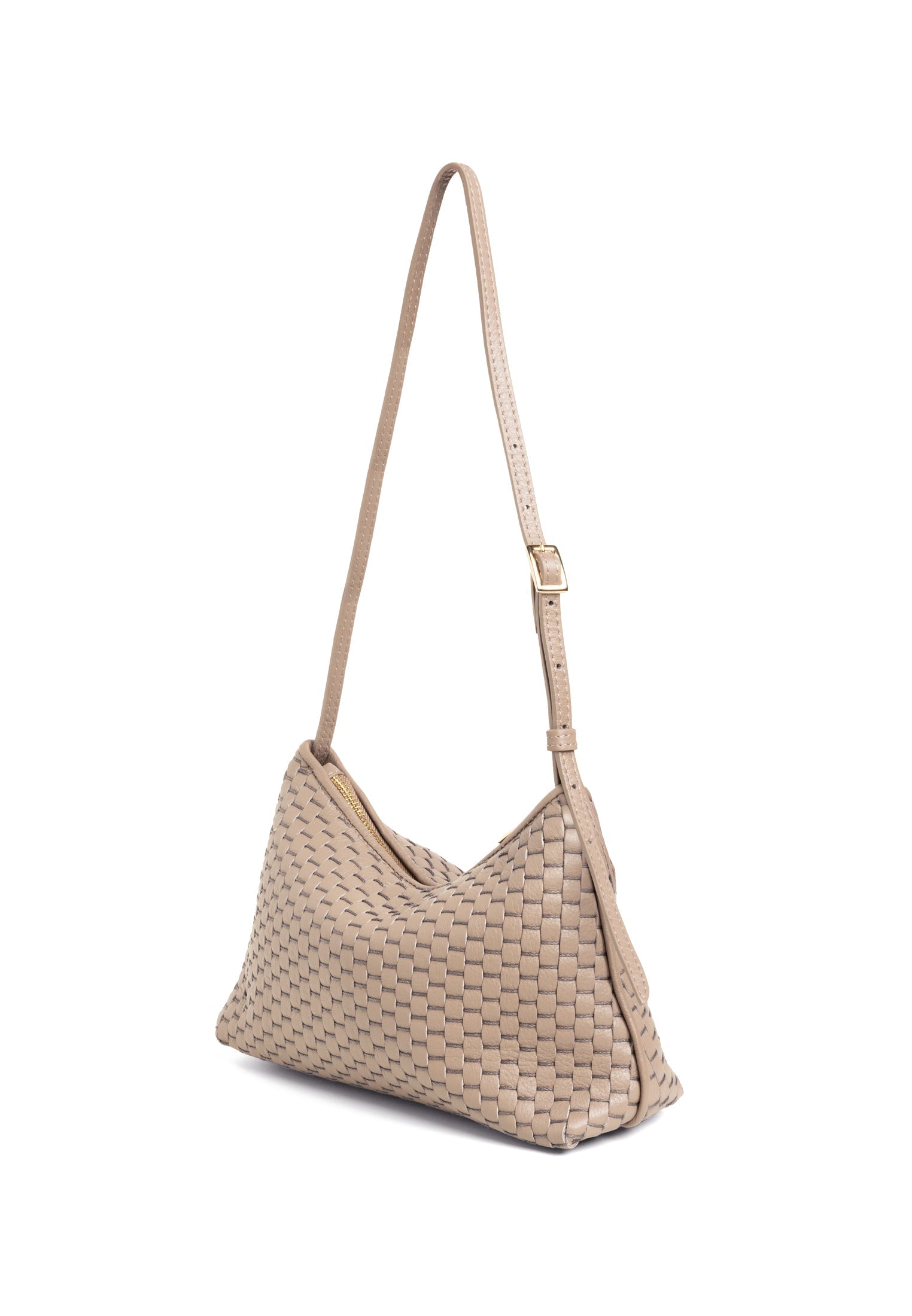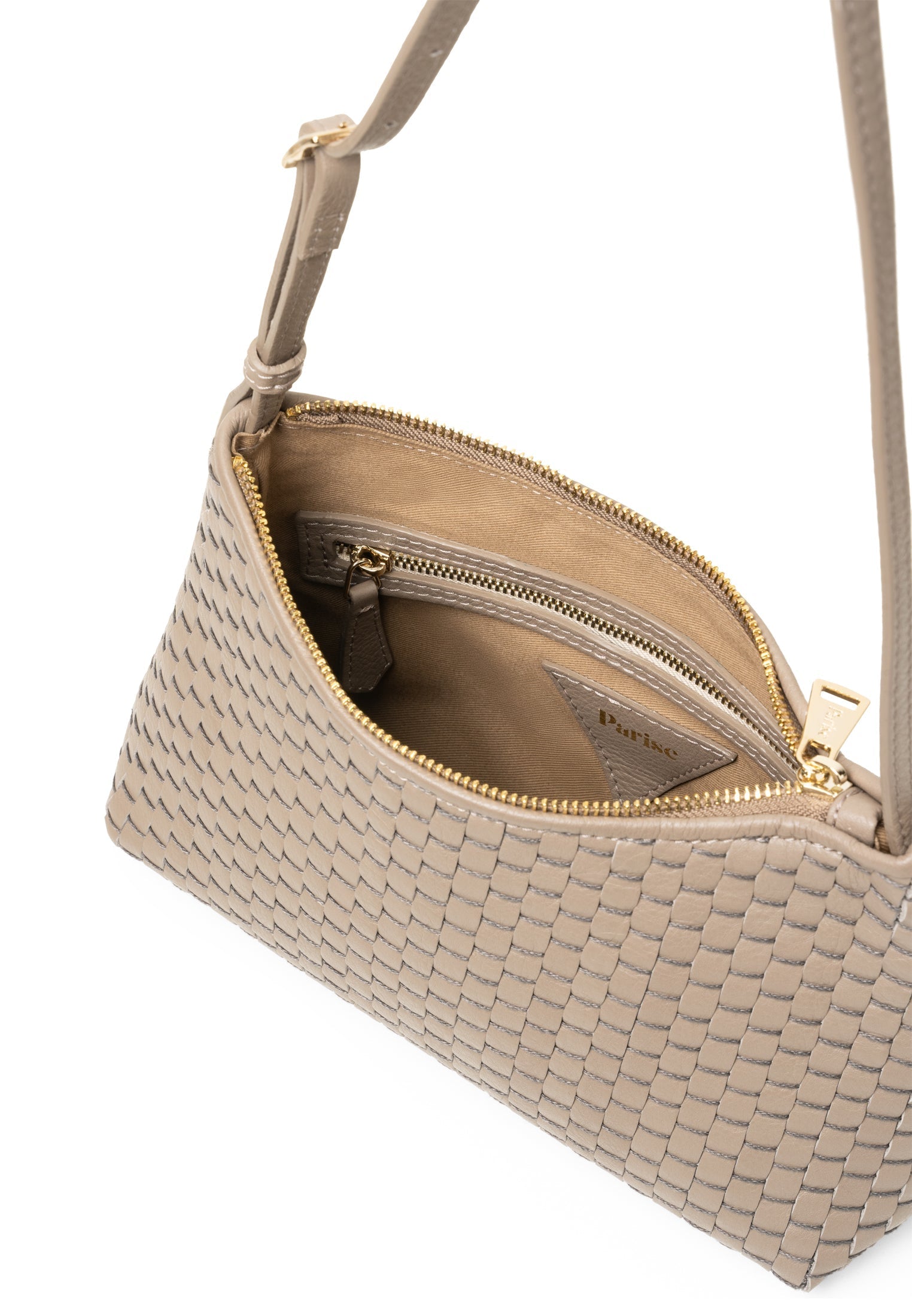 Product: '81' Baguette Acacia- Compact but but generous enough to comfortably hold a water bottle - Adjustable shoulder strap allows for shoulder or arm wear - Zip closure for secure access - Internal zipped pocket to organise your essentials - White gold colored hardware - Soft and durable 100% cotton lining - Protective dust bag included for lasting beauty - Made in Italy - Premium 100% bovine leather woven with 100% cotton yarn on 18th century treadle looms