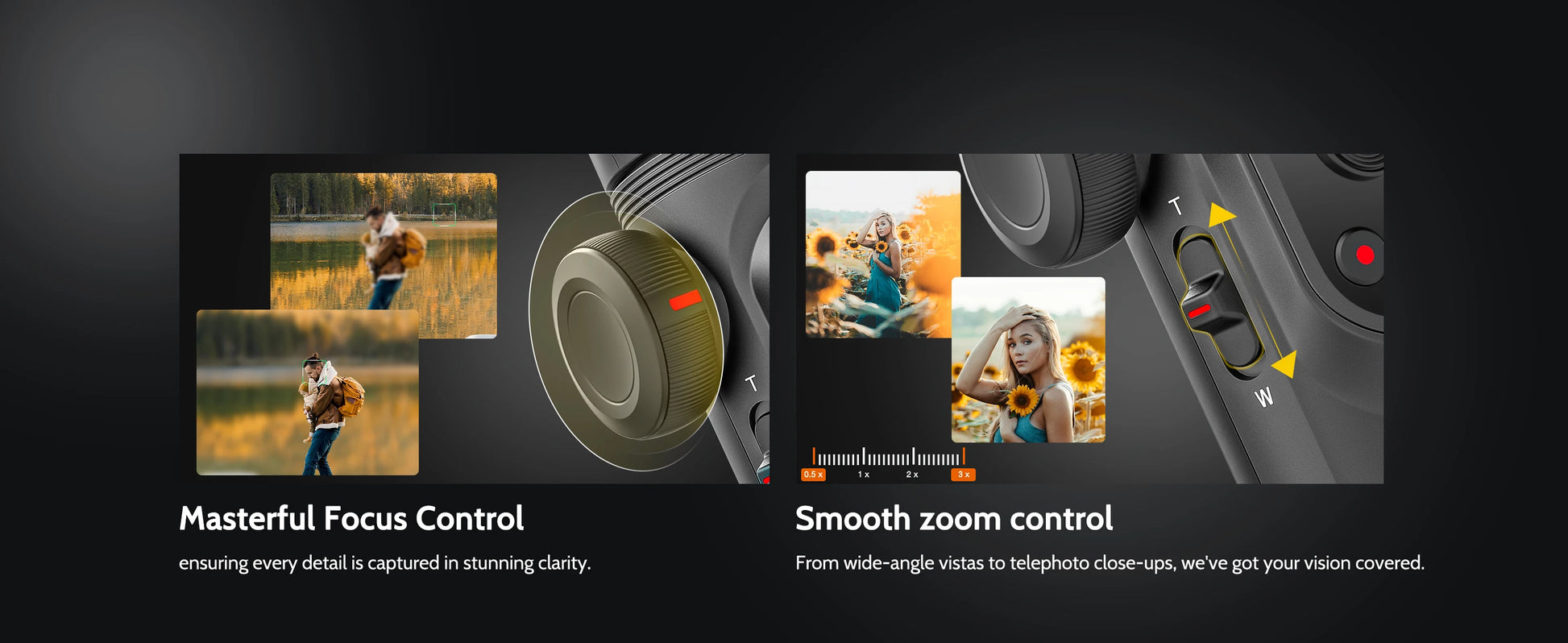 - Focalizarea precisă și controlul zoomului permit control cinematografic direct pe gimbal.