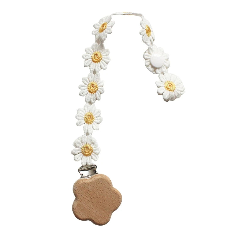 Clemă elegantă și fiabilă pentru suzetă, cu design de dantelă mică, care fixează tetina în siguranță, protejând în același timp pielea sensibilă a bebelușului.