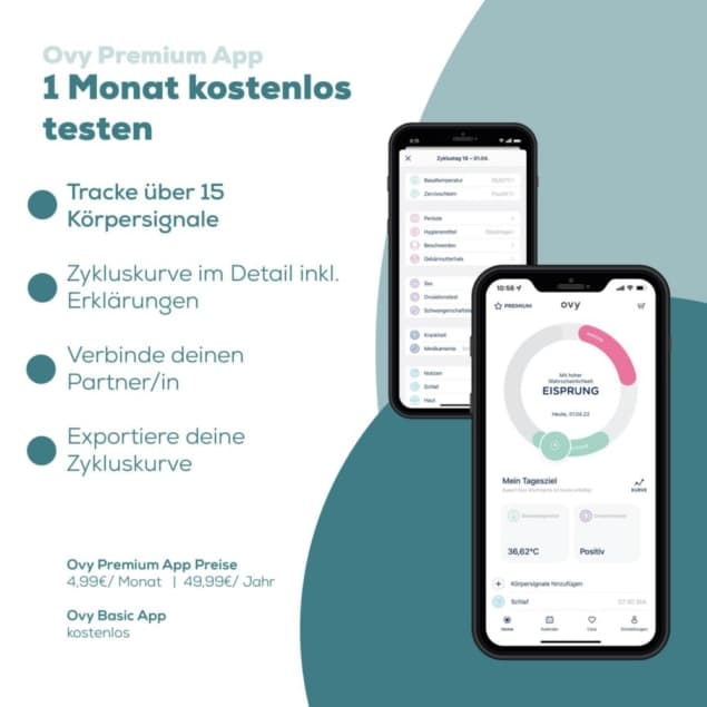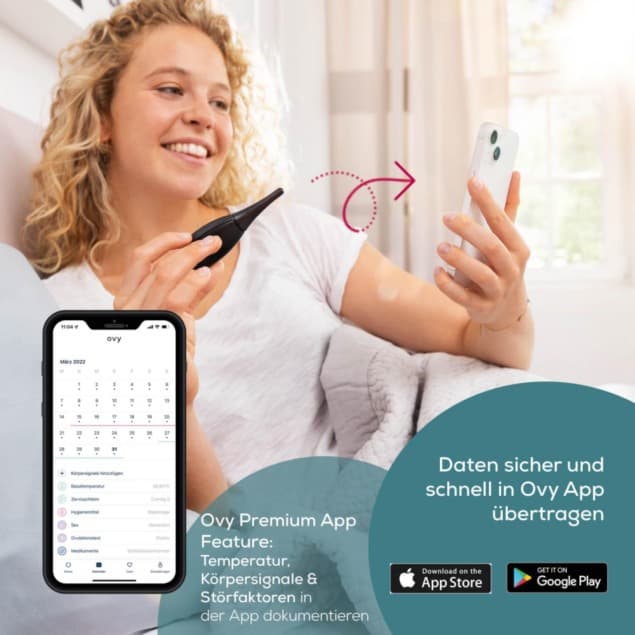 Termometrul bazal OT 30 măsoară temperatura corpului imediat după trezire – oral sau vaginal. Valorile sunt transmise prin Bluetooth® Low Energy către aplicația Ovy, care calculează automat zilele fertile și infertile. În aplicație pot fi înregistrate și alte semnale corporale, cum ar fi modificările mucusului cervical sau alți factori care pot interfera cu fertilitatea. În plus, aplicația oferă recomandări privind dieta, exercițiile fizice și gestionarea ciclului menstrual.