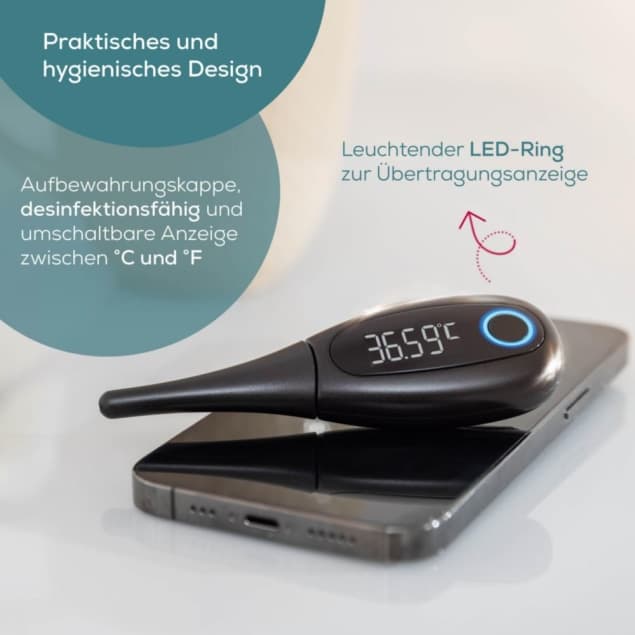Cu Beurer OT 30, beneficiați de un termometru extrem de precis, aprobat medical, pentru planificare familială fără hormoni, inteligentă și naturală. Este ușor de utilizat, igienic și se conectează automat la aplicația de urmărire a ciclului dumneavoastră.