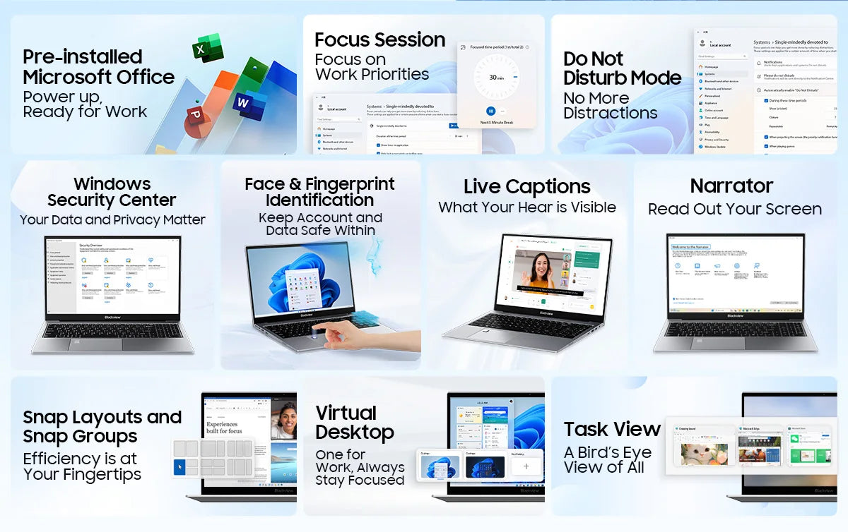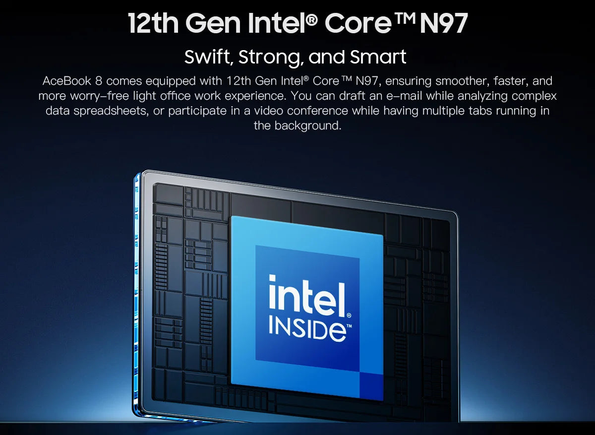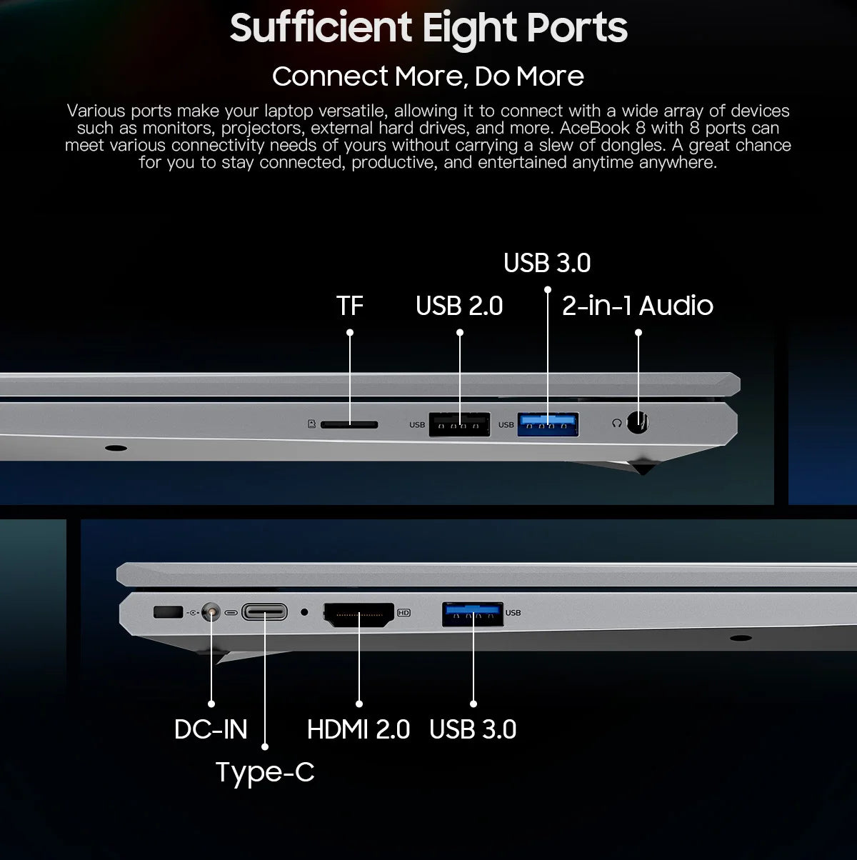 Blackview AceBook 8 combină un ecran Full HD mare cu un procesor Intel rapid și o memorie RAM generoasă, permițându-vă să rulați fără probleme aplicații solicitante și să lucrați eficient din mers.
