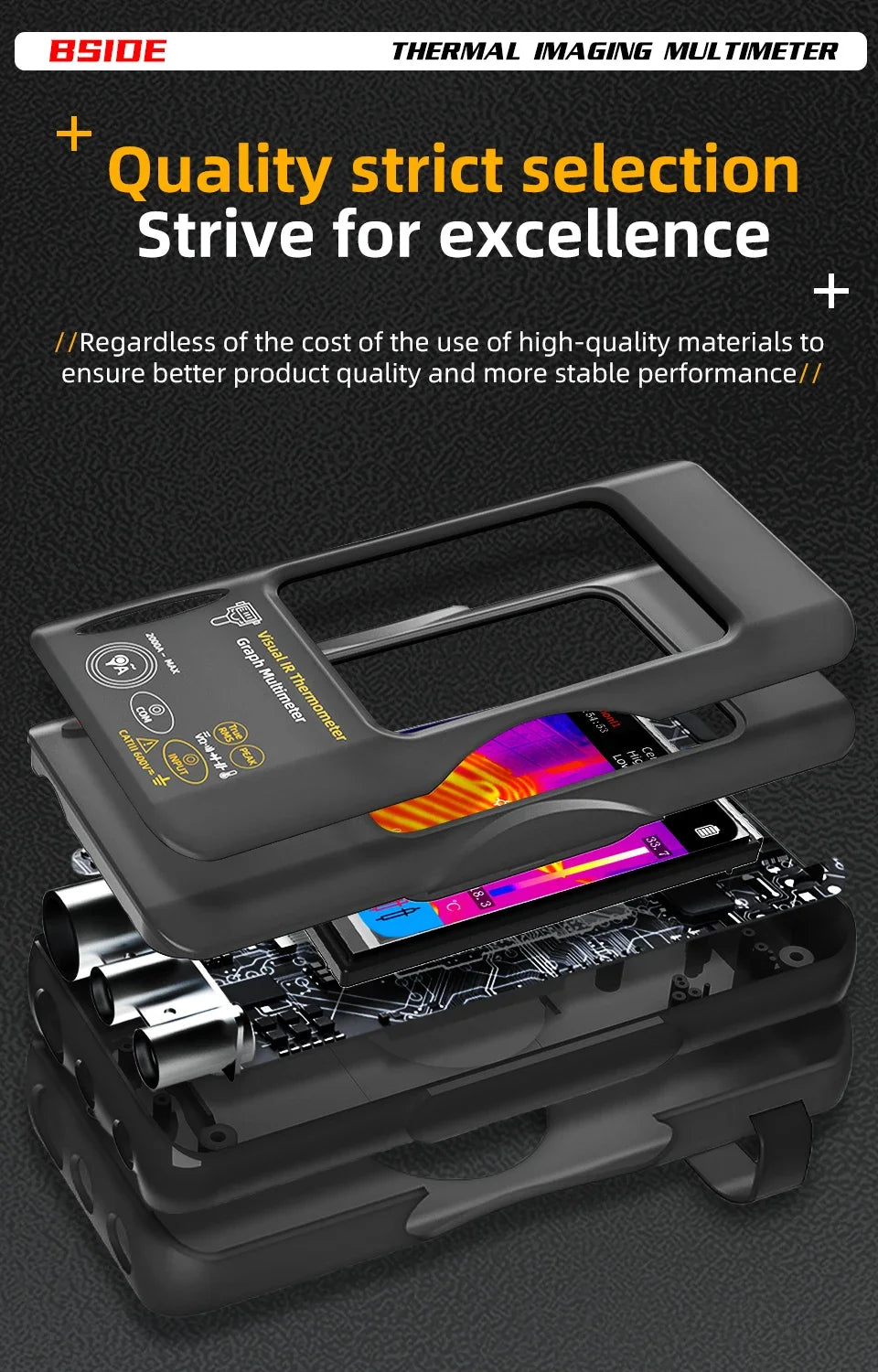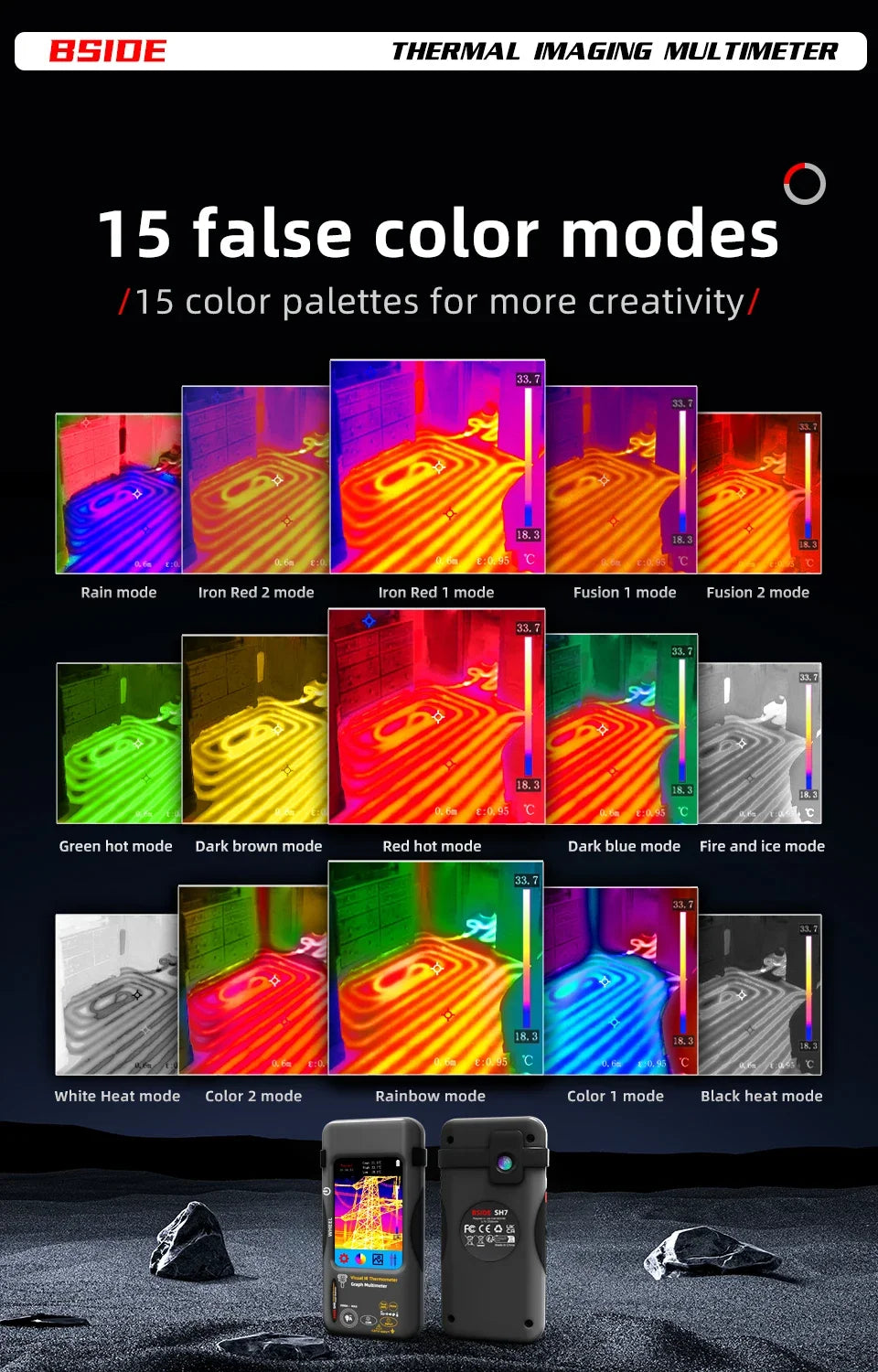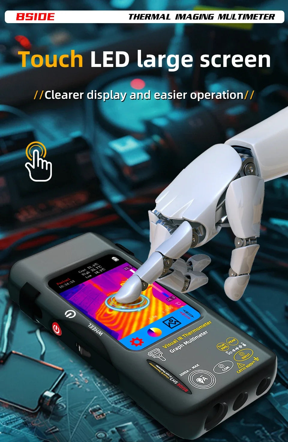 BSIDE SH7 combină termografia de înaltă rezoluție cu un multimetru digital într-un singur dispozitiv compact – pentru depanare rapidă, sigură și precisă a componentelor electronice, mașinilor și clădirilor.