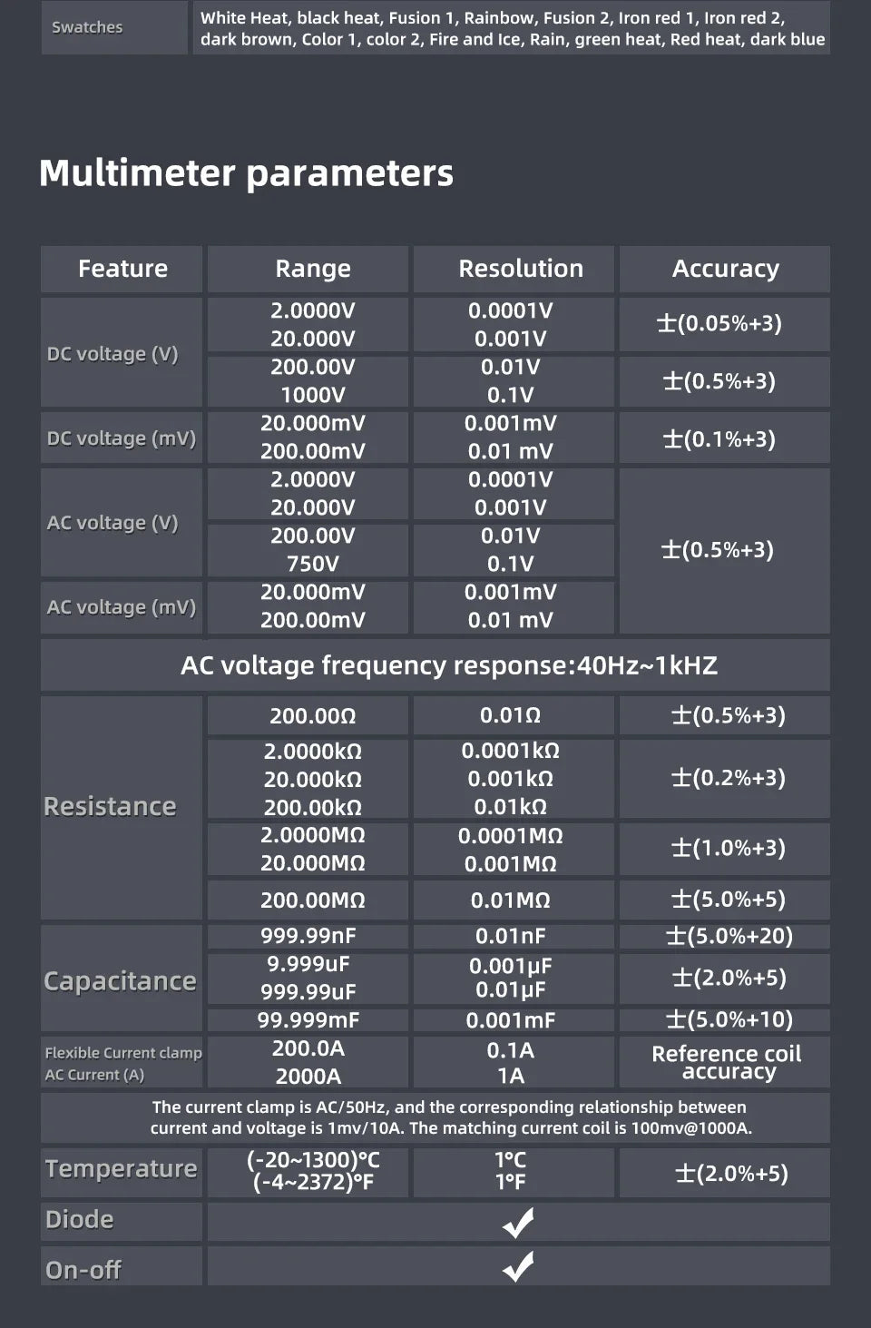 - Multimetru: Dispozitiv de măsurare digital cu până la 20.000 de numărări pentru tensiune, curent și rezistență