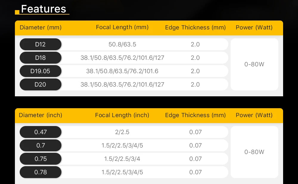 - Performanță scalabilă: Indiferent dacă este vorba de gravare fină sau de tăiere rapidă, combinația potrivită între diametru și distanță focală optimizează rezultatele și eficiența.