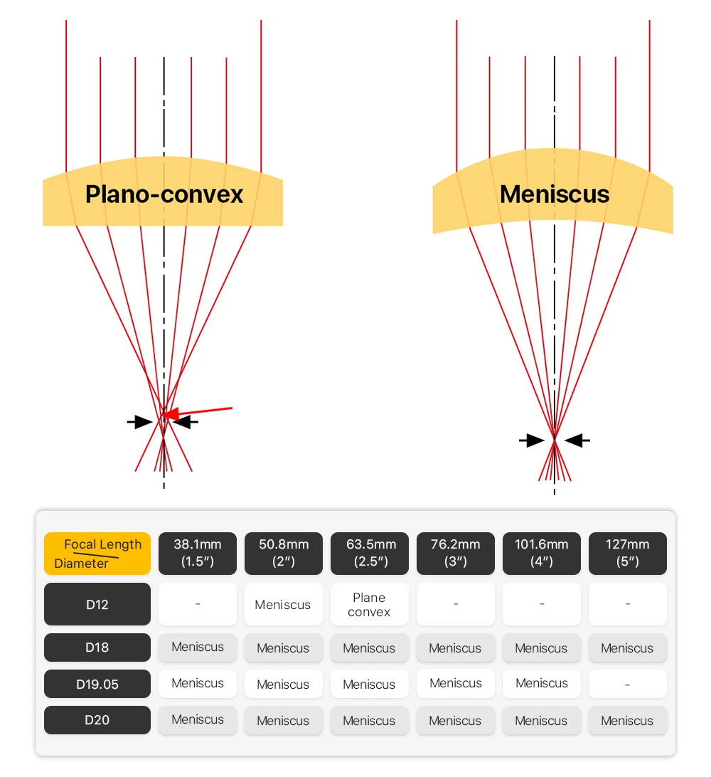 - Modelare optimă a fasciculului: Forma de menisc a lentilei reduce aberațiile și asigură un punct de focalizare consistent și clar, permițând tăieturi curate și detalii fine de gravare.