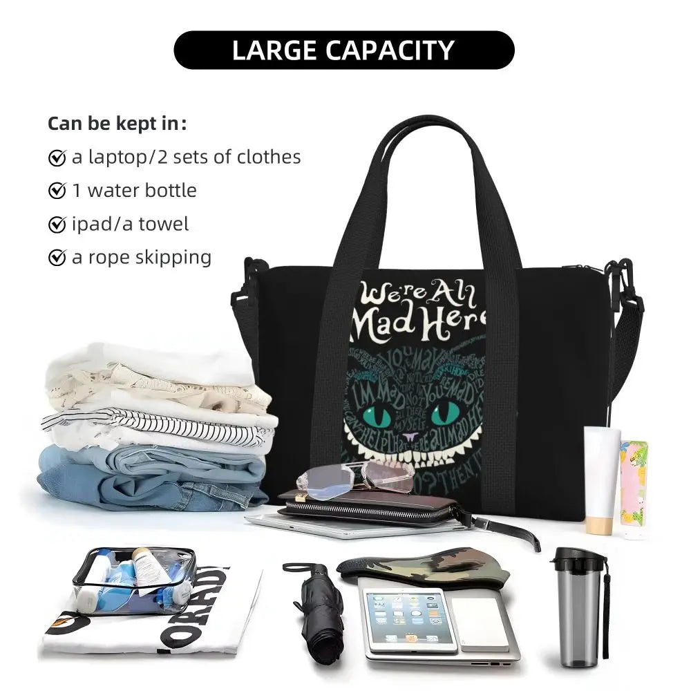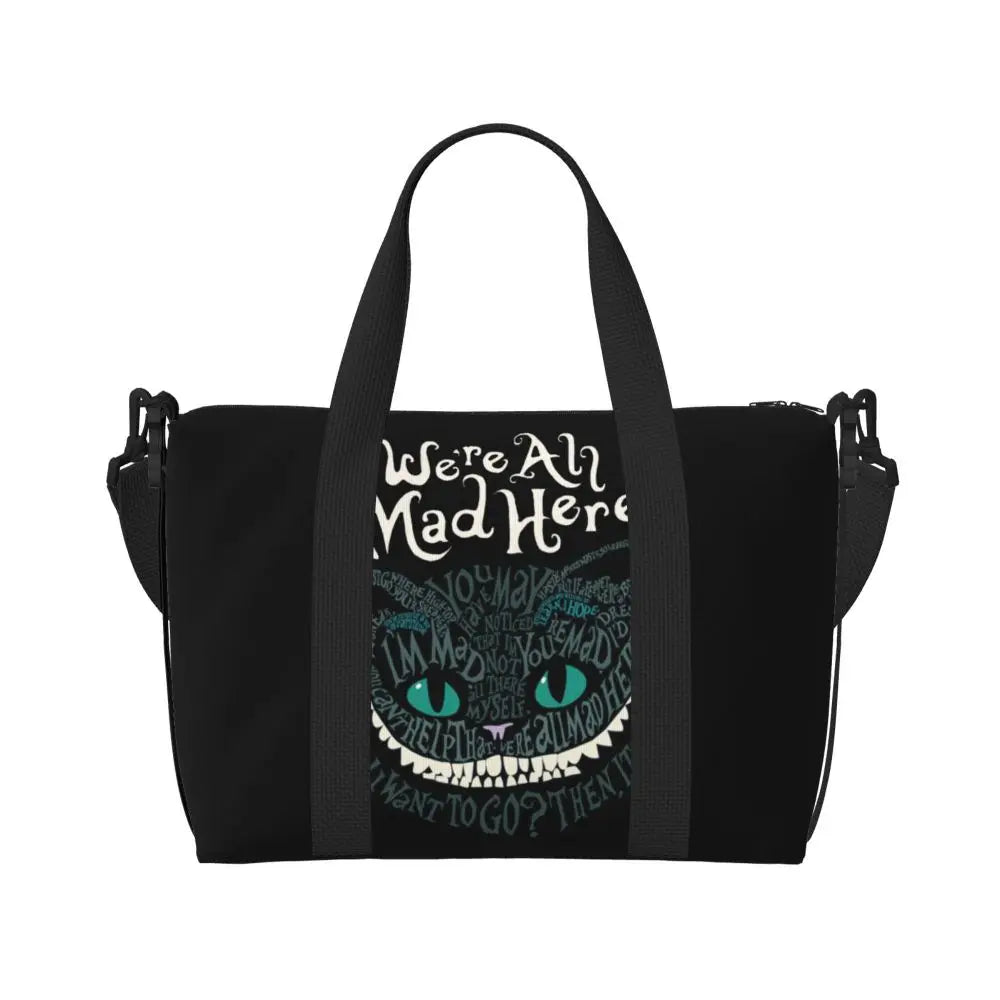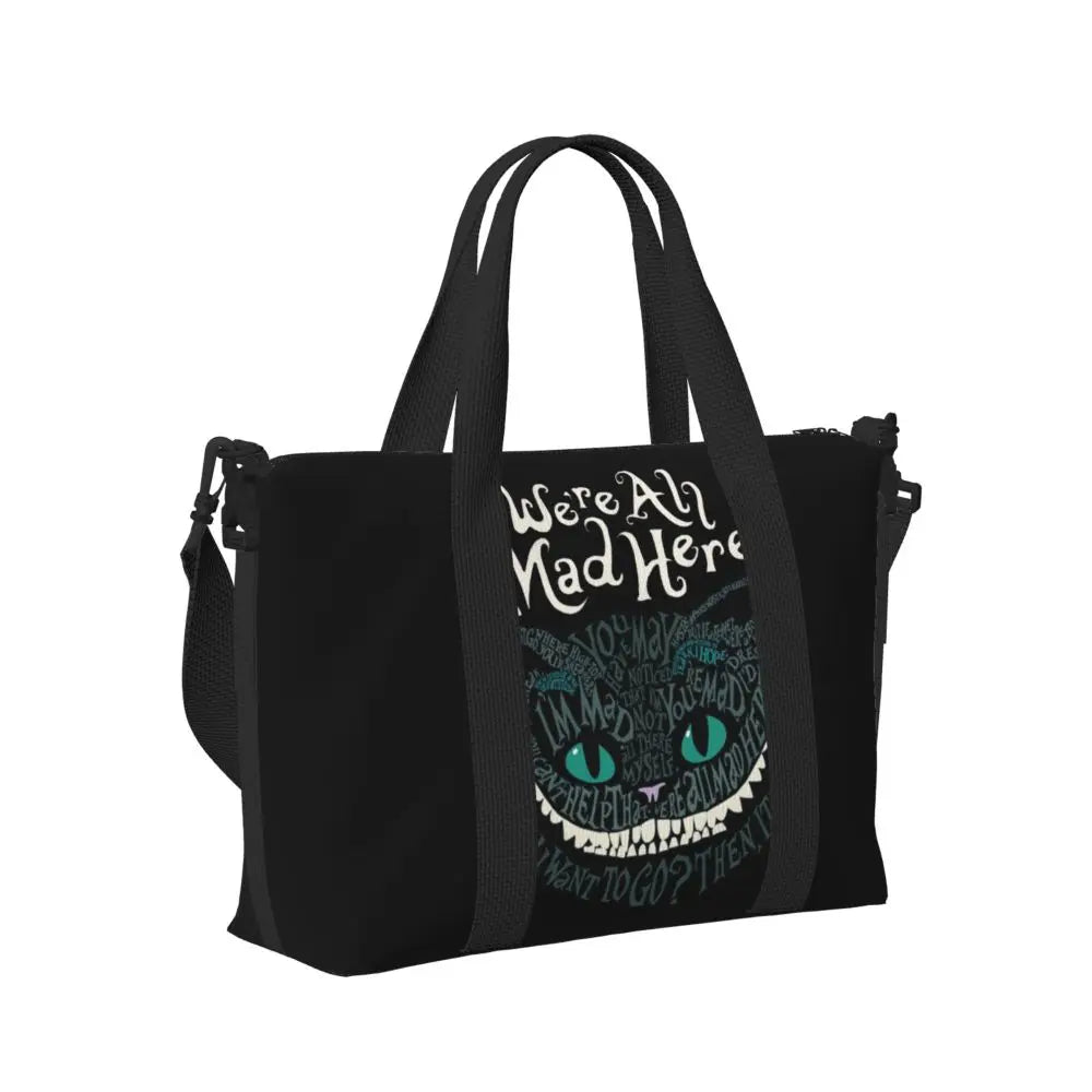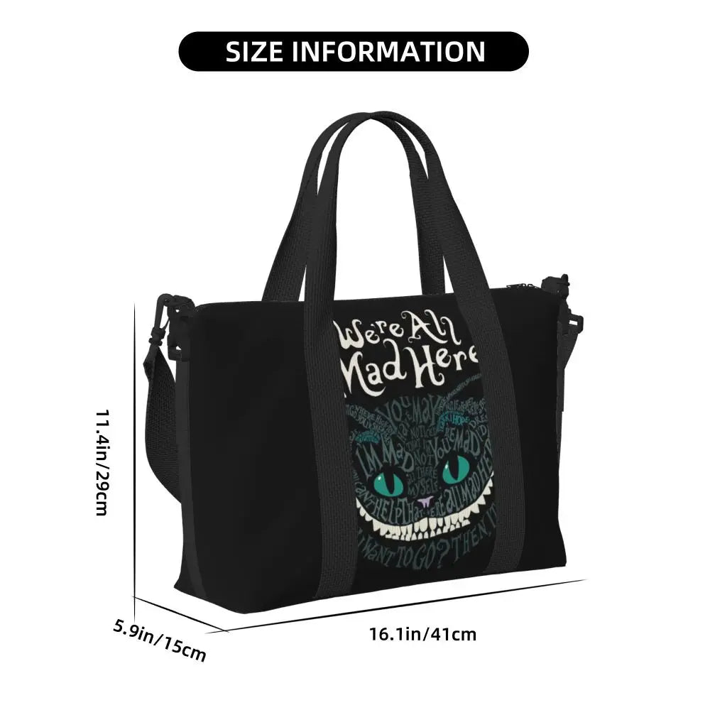 Geantă de plajă personalizată cu pisica Cheshire pentru femei, cu compartiment mare pentru sală și plajă, We're All Mad Here Cat