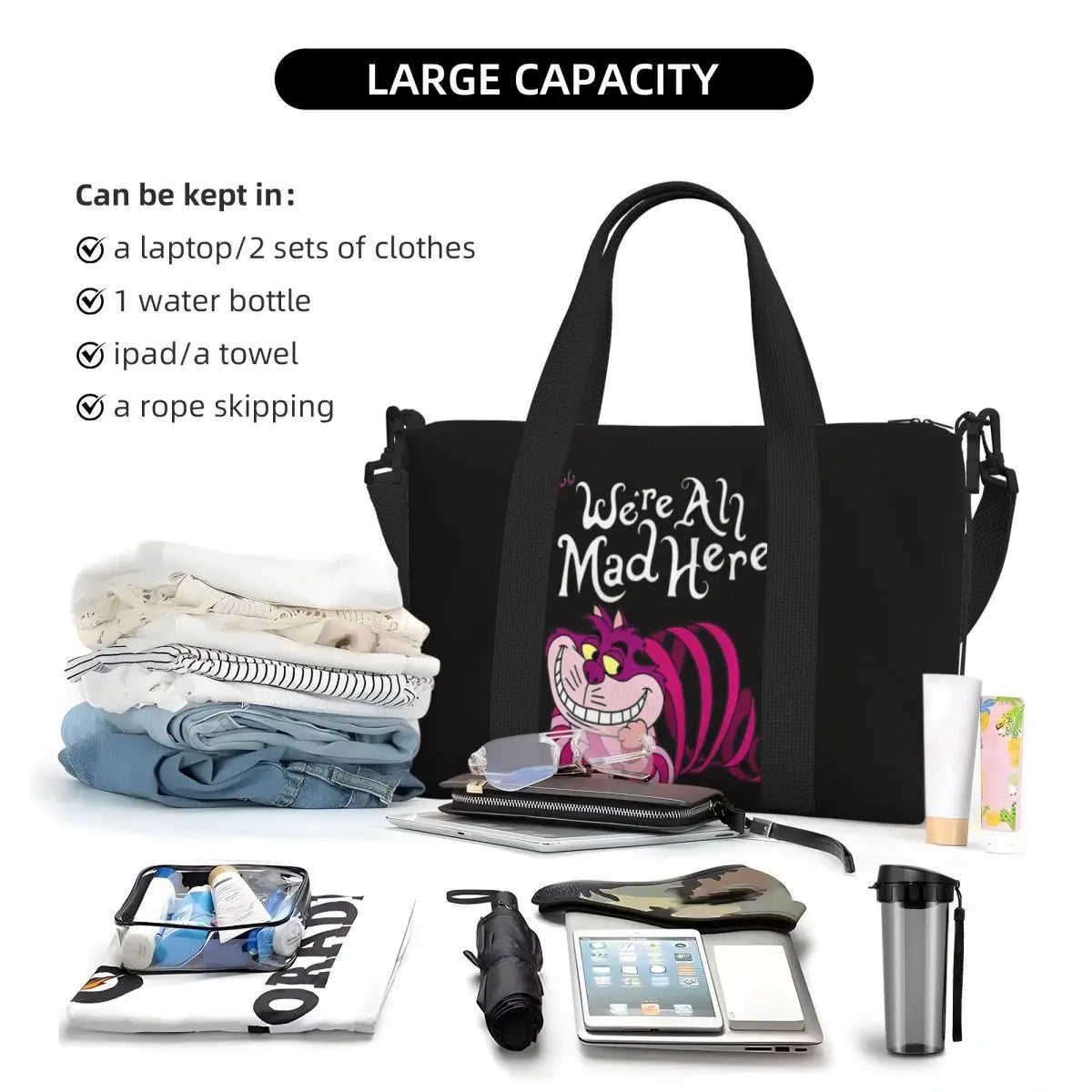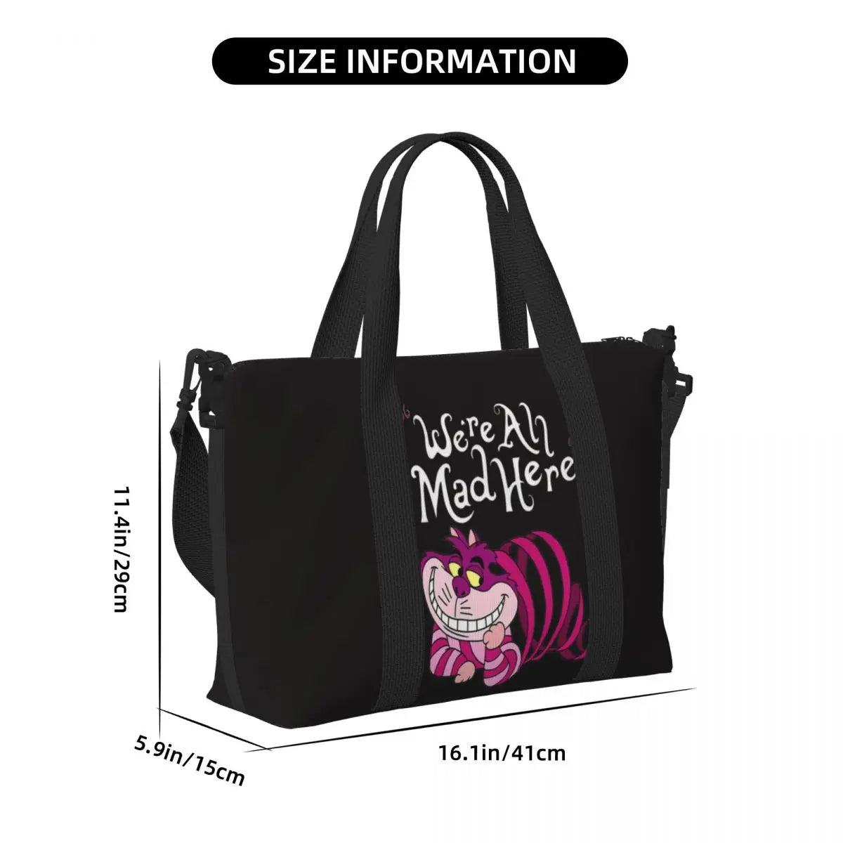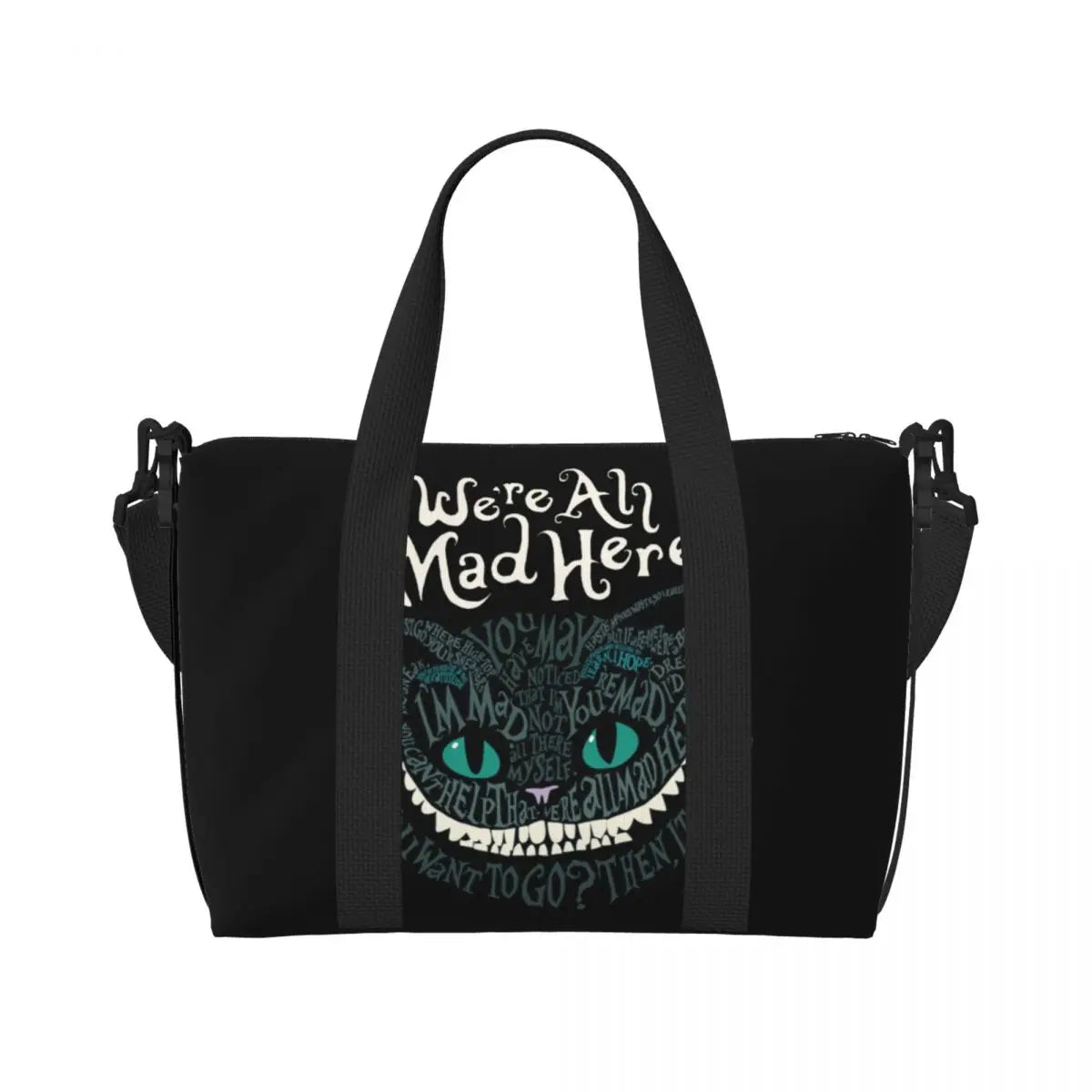 Geantă de plajă personalizată cu pisica Cheshire pentru femei, cu compartiment mare pentru sală și plajă, We're All Mad Here Cat