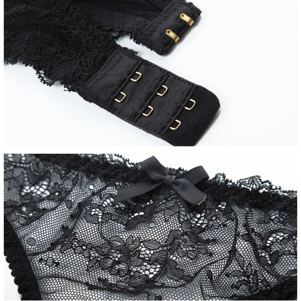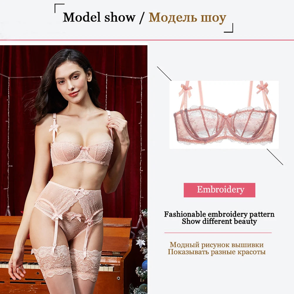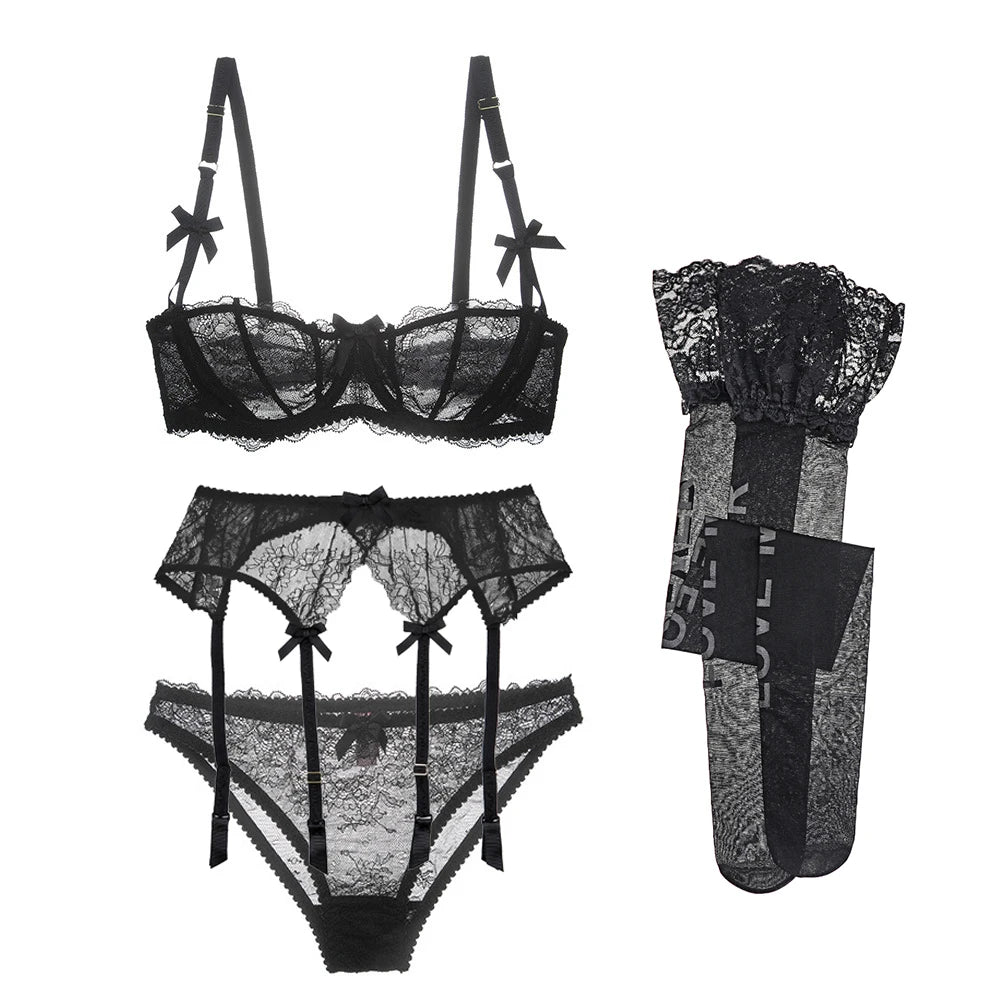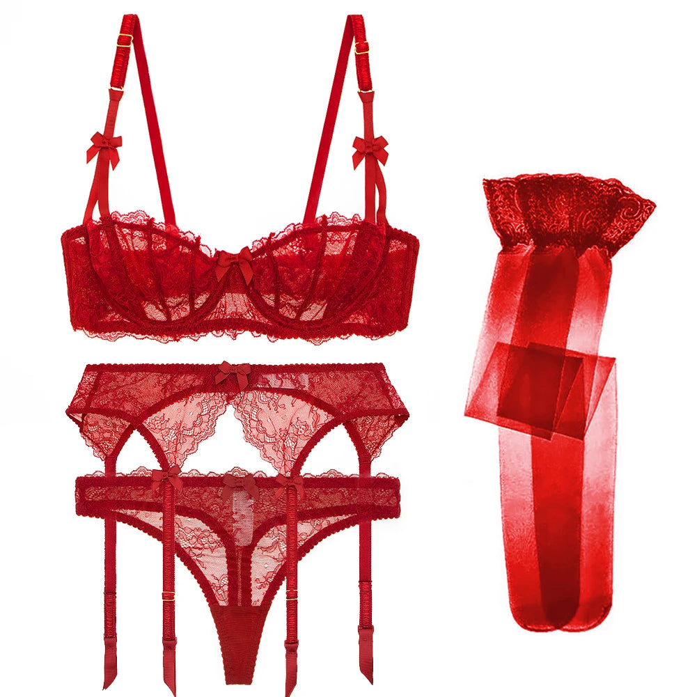 CYHWR Lenjerie elegantă de lux cu jumătate de cupă, dantelă transparentă, stil coajă solidă, ultra-subțire, 4 piese/loturi, sutien și jartieră