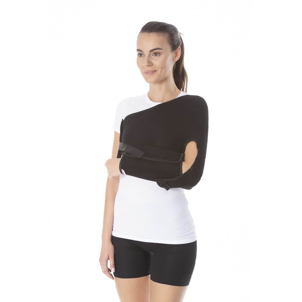 Orteza fixează umărul și partea superioară a brațului strâns pe corp, previne mișcările necontrolate și reduce riscul de deteriorare ulterioară.