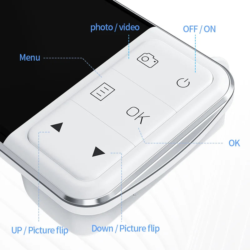 - Comenzi intuitive direct pe dispozitiv pentru acces rapid la înregistrare, luminozitatea ecranului și redare.